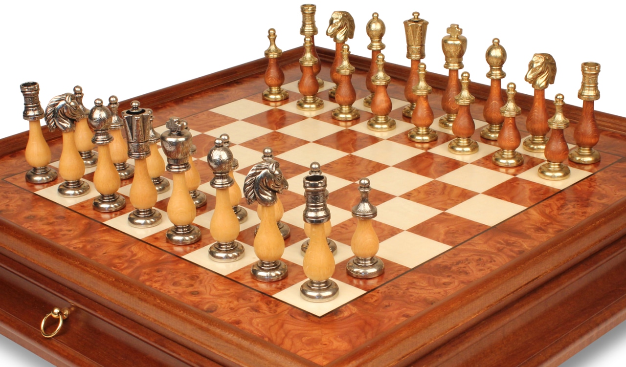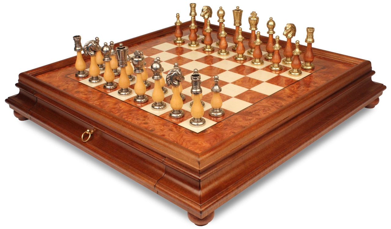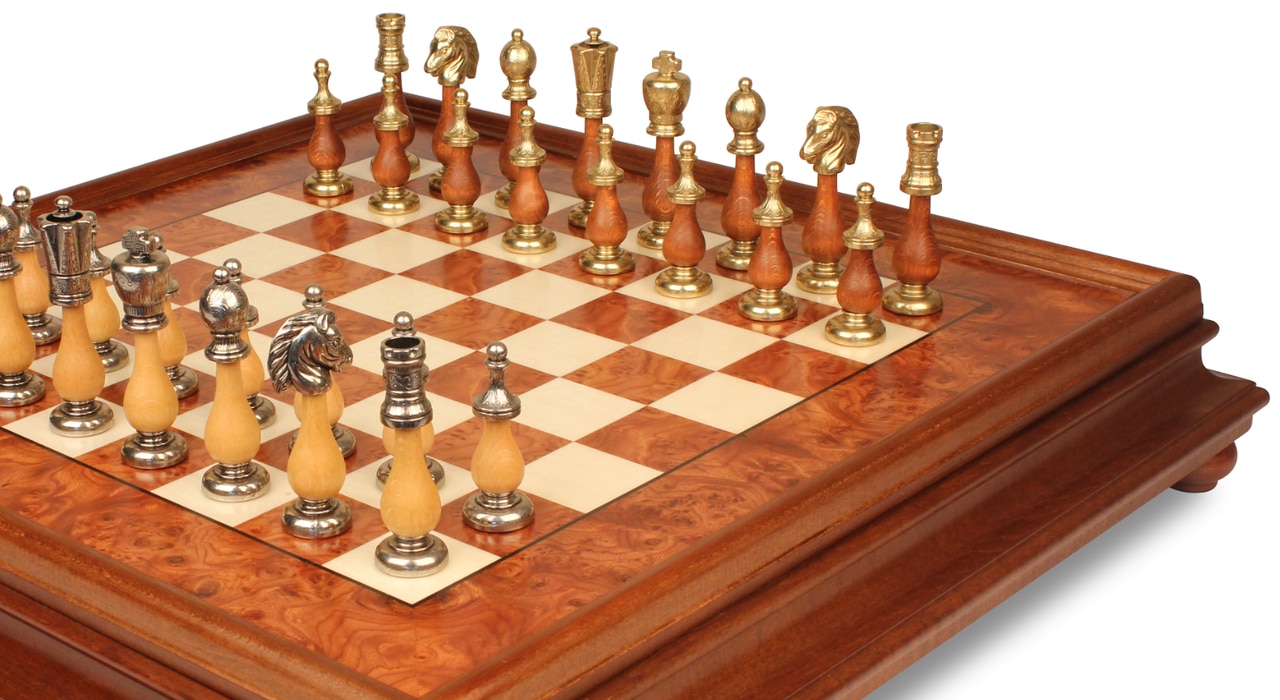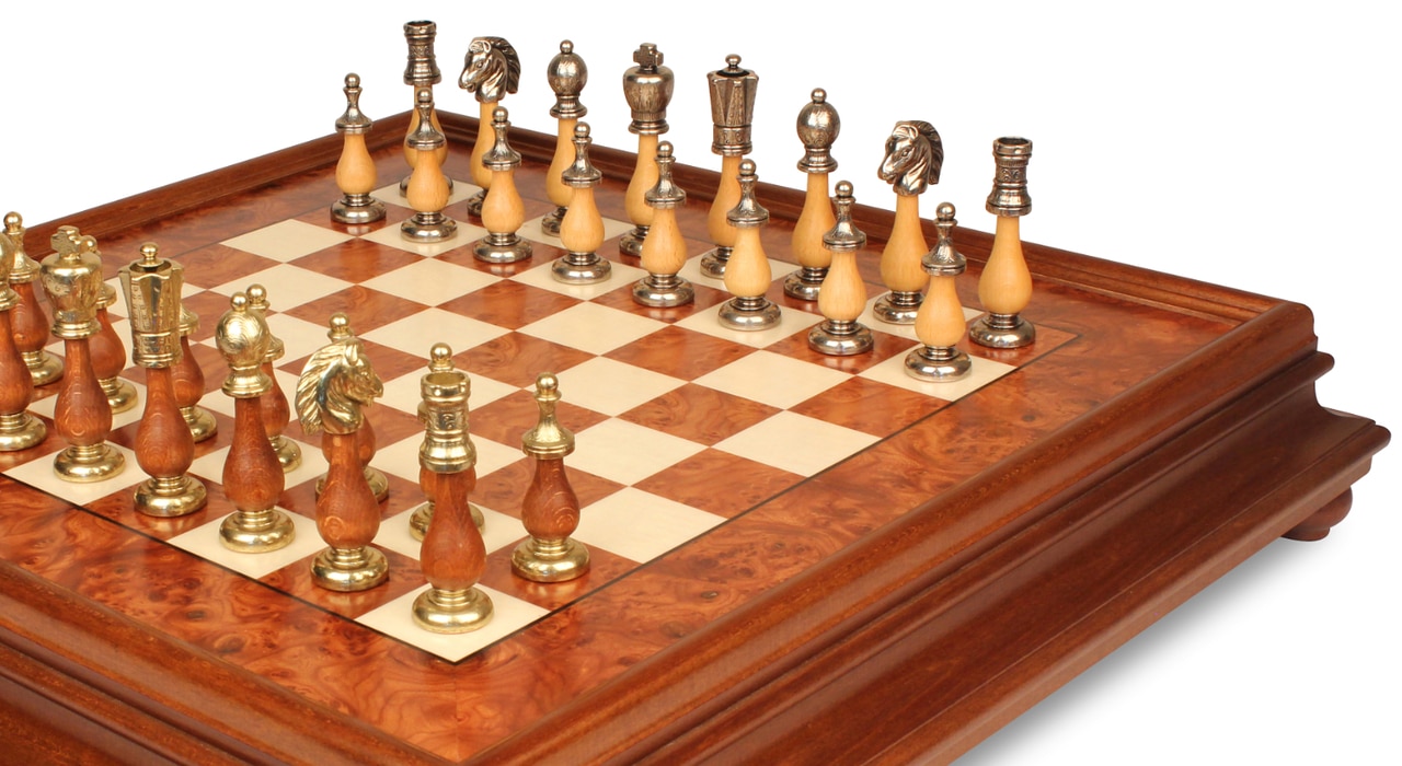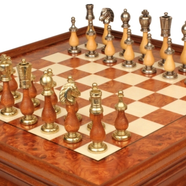 Arabesque Schachspiel – Schachbrett aus Erlen- und Wurzelholz mit Schublade & Figuren aus Metall und Holz