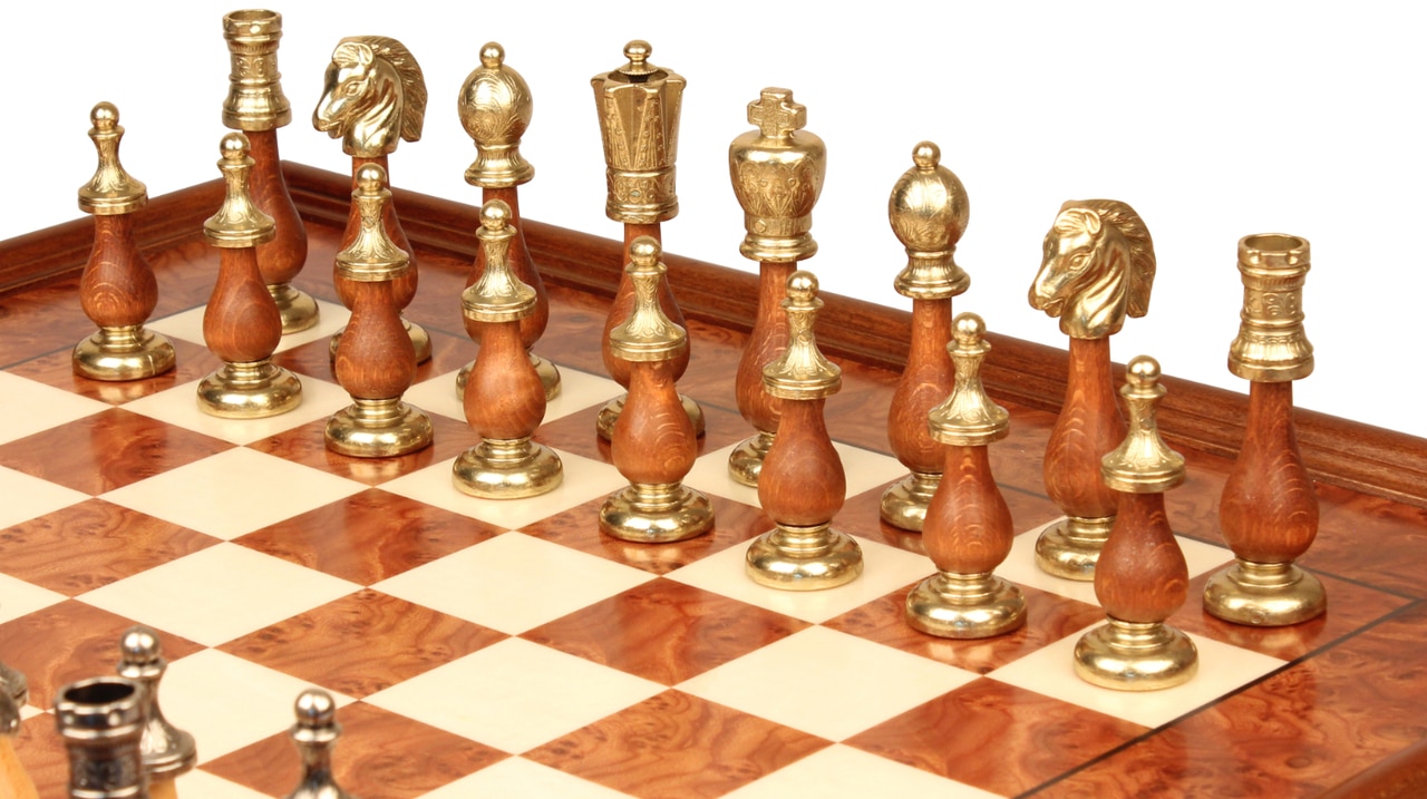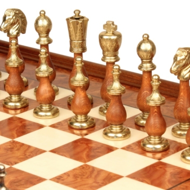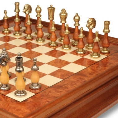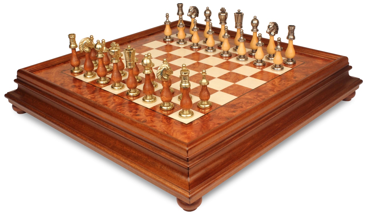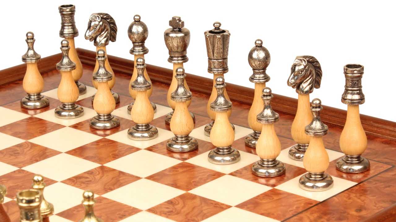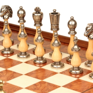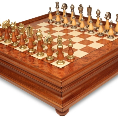 Arabesque Schachspiel – Schachbrett aus Erlen- und Wurzelholz mit Schublade & Figuren aus Metall und Holz