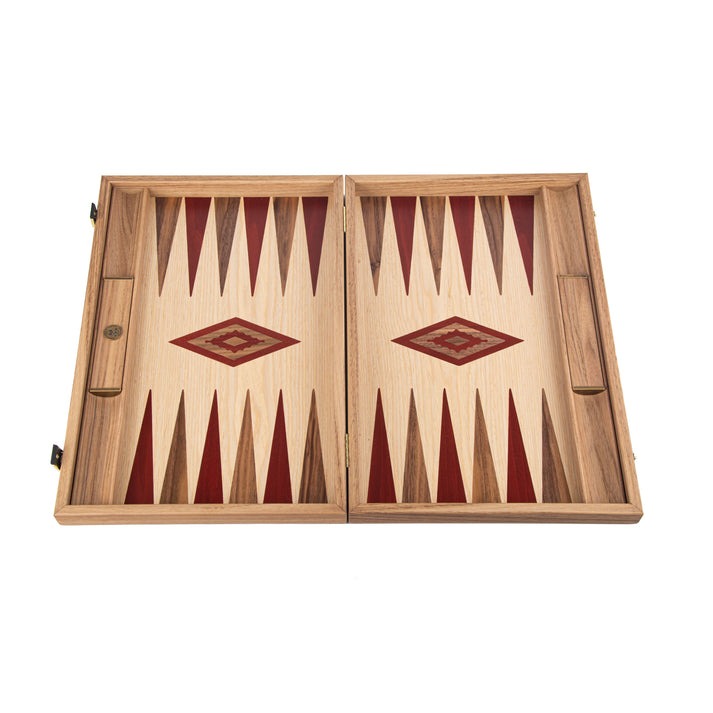 Entdecken Sie die zeitlose Eleganz unseres Backgammon aus Eichen- und amerikanischem Nussbaum mit seitlichen Halterungen.