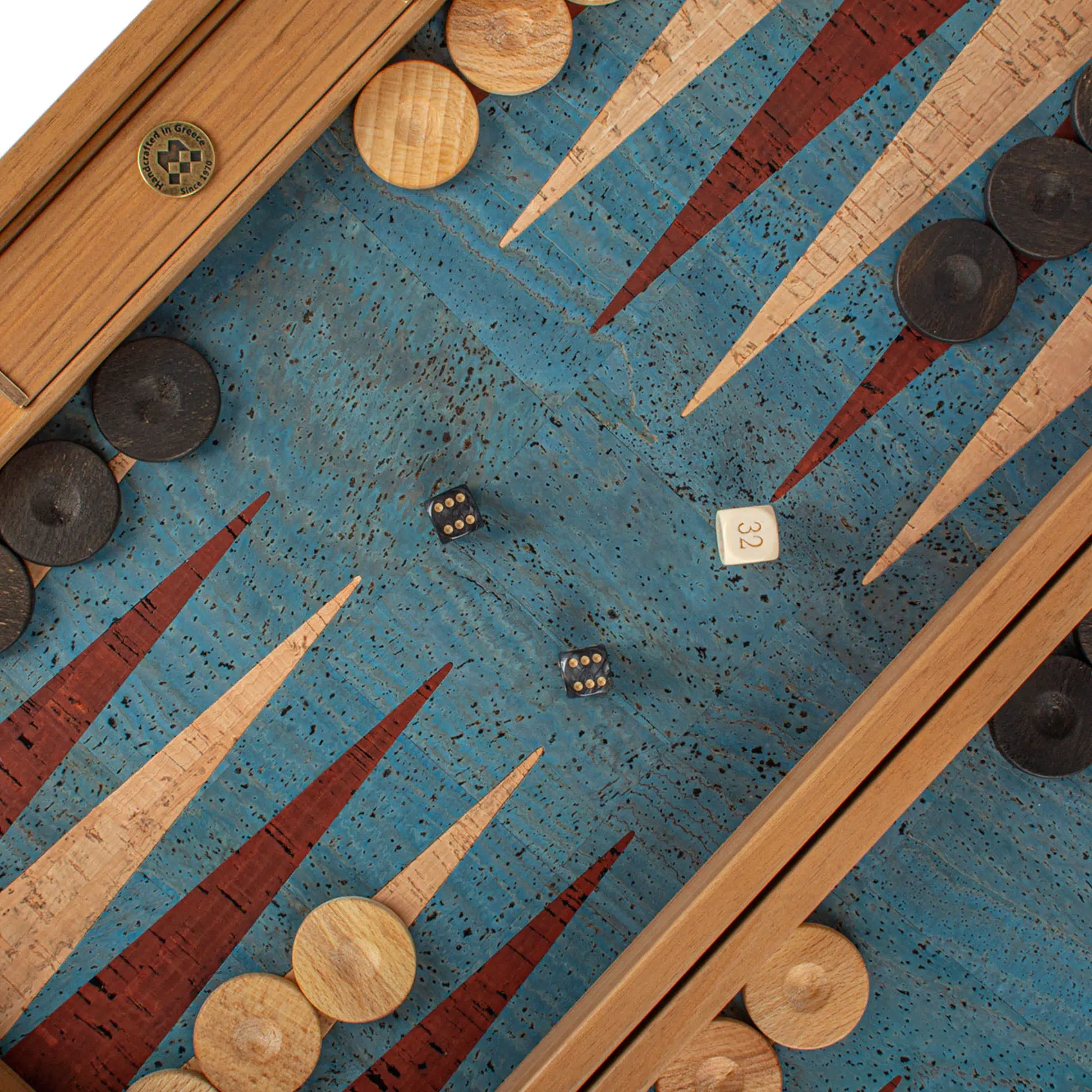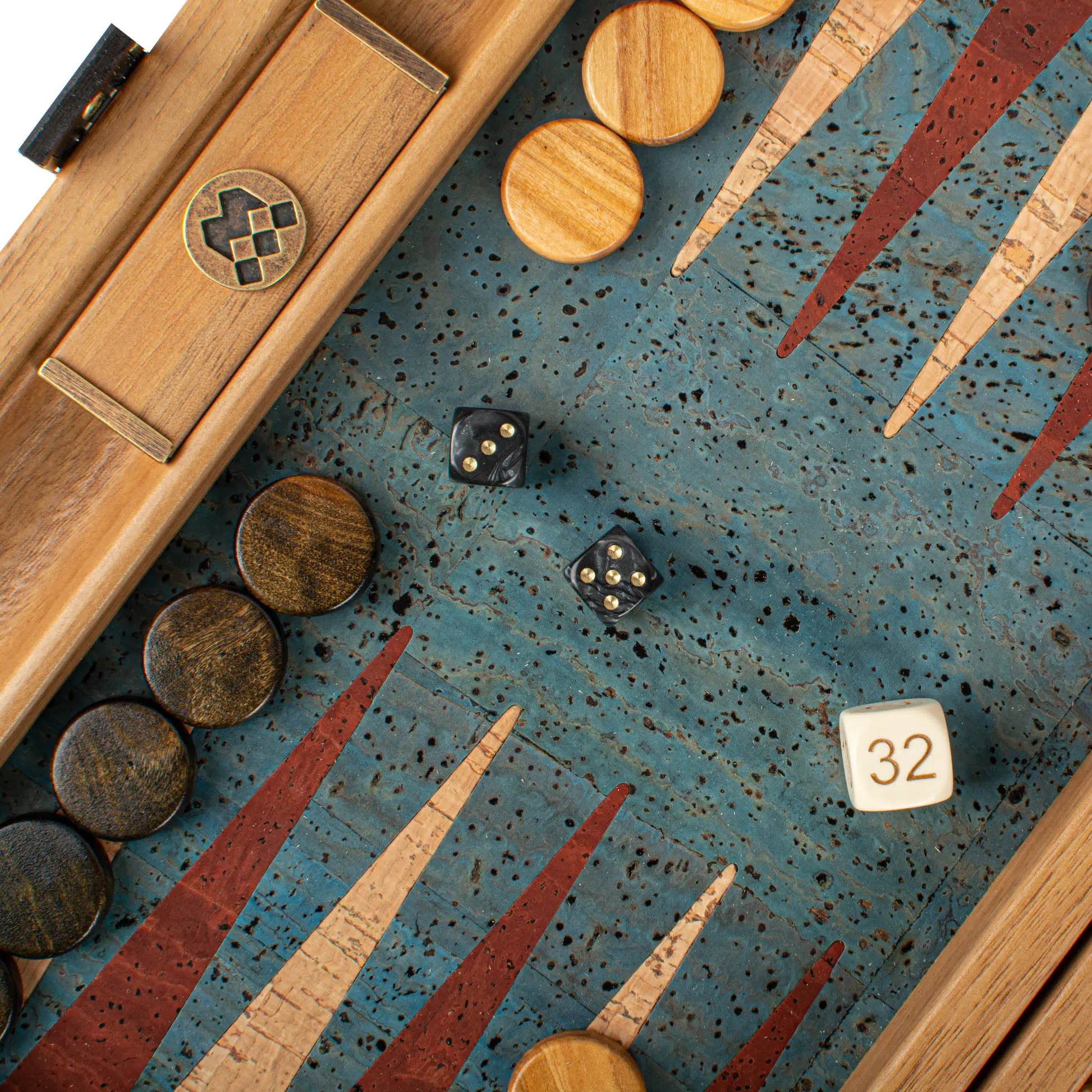 Backgammon aus natürlichem Kork in Türkis mit Schachfiguren aus Eichenholz