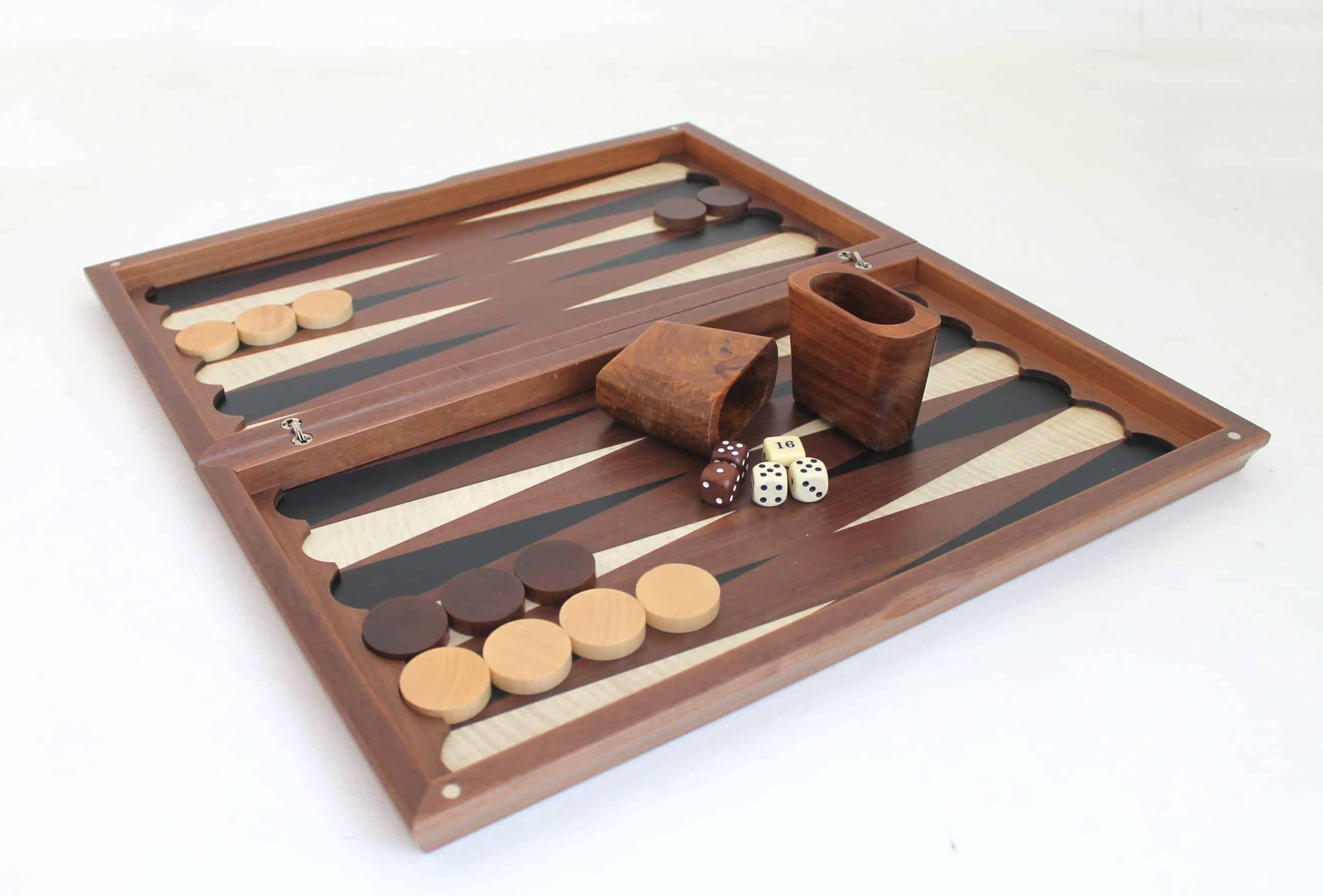 Ein Backgammon-Spiel original durch die Auswahl des verwendeten Holzes, Eukalyptus, das ein hellrosanes bis hellbraunes Holz ist.