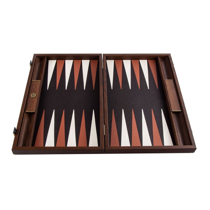 Dieses Set umfasst 30 Spielsteine aus Perlmutt, perfekt ausgewogen (15 braun und 15 weiß), sowie 4 Würfel, 1 Doublierwürfel und ein Paar Würfelbecher aus Holz.