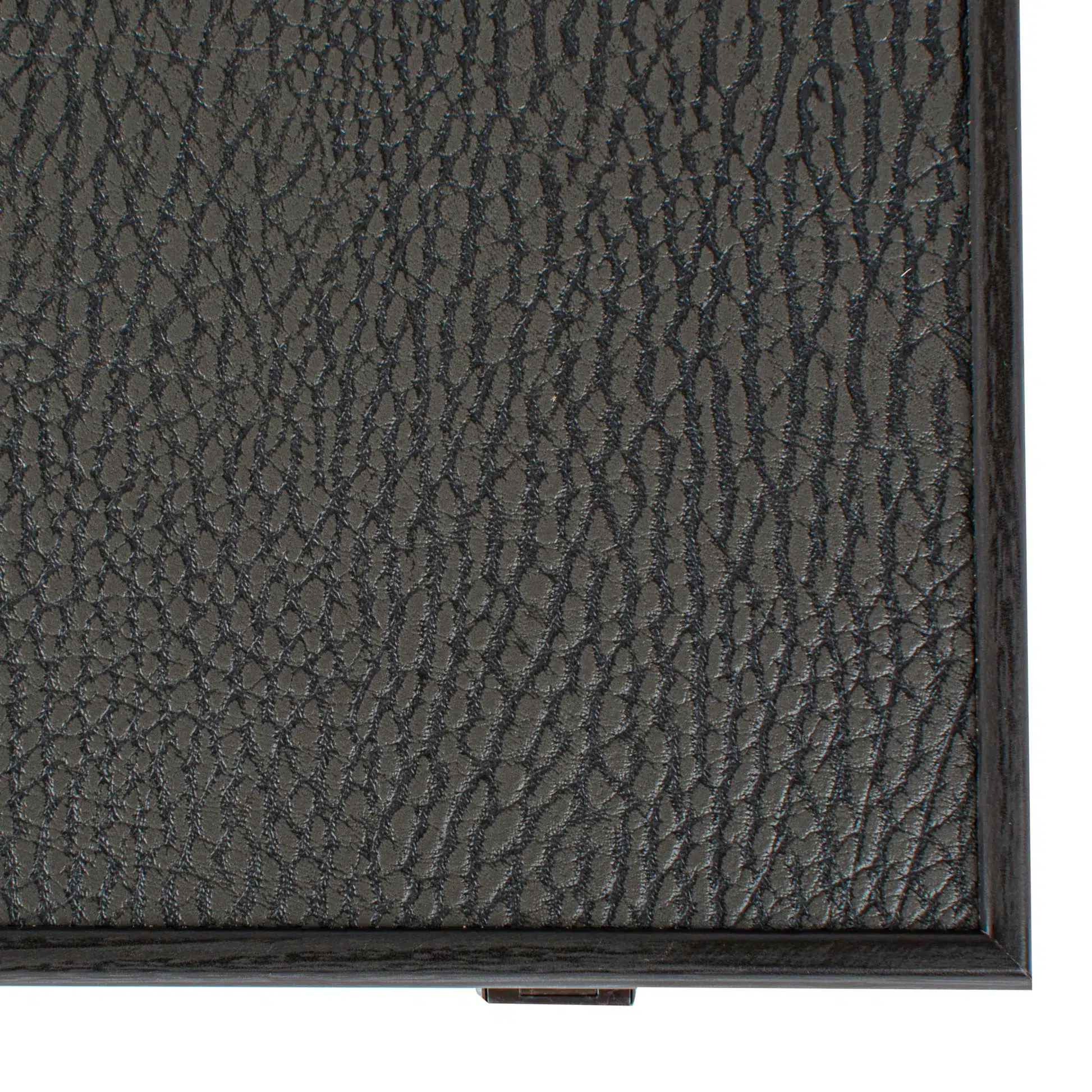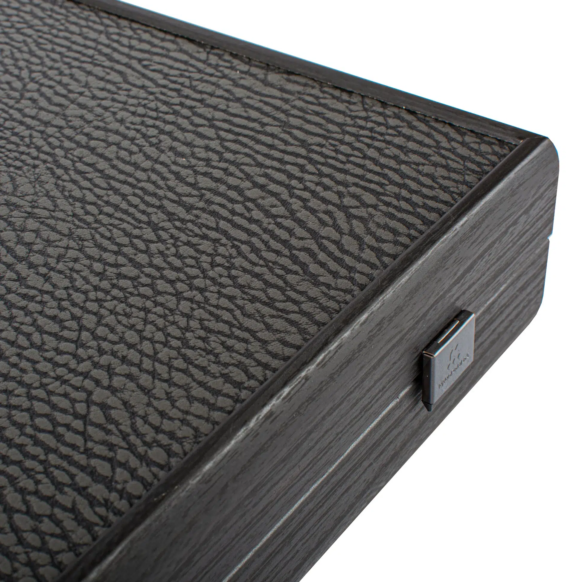 Das Spielbrett ist aus grauem Kunstleder, verziert mit schrägen Dreiecksmustern, die einen auffälligen visuellen Kontrast schaffen. Die Außenseite ist aus Laminat, was eine hohe Langlebigkeit gewährleistet. Das Set umfasst 30 Spielsteine (15 schwarz und 15 weiß), vier Würfel, einen Würfelbecher sowie Würfelbecher aus Holz.