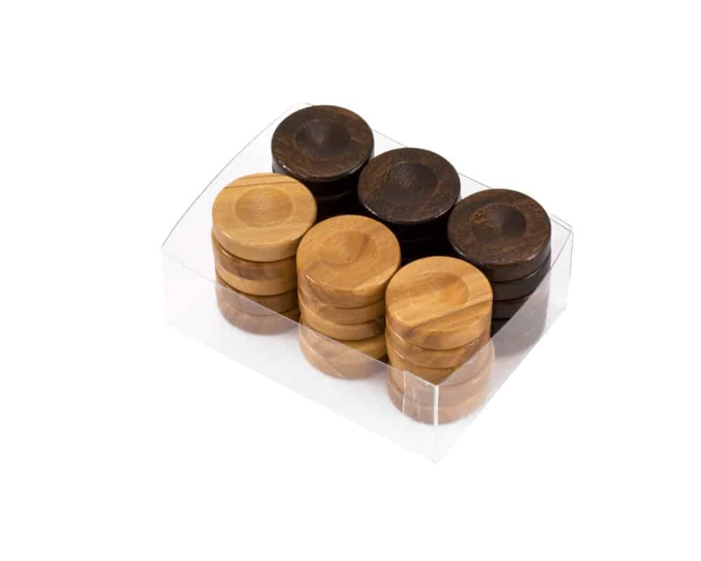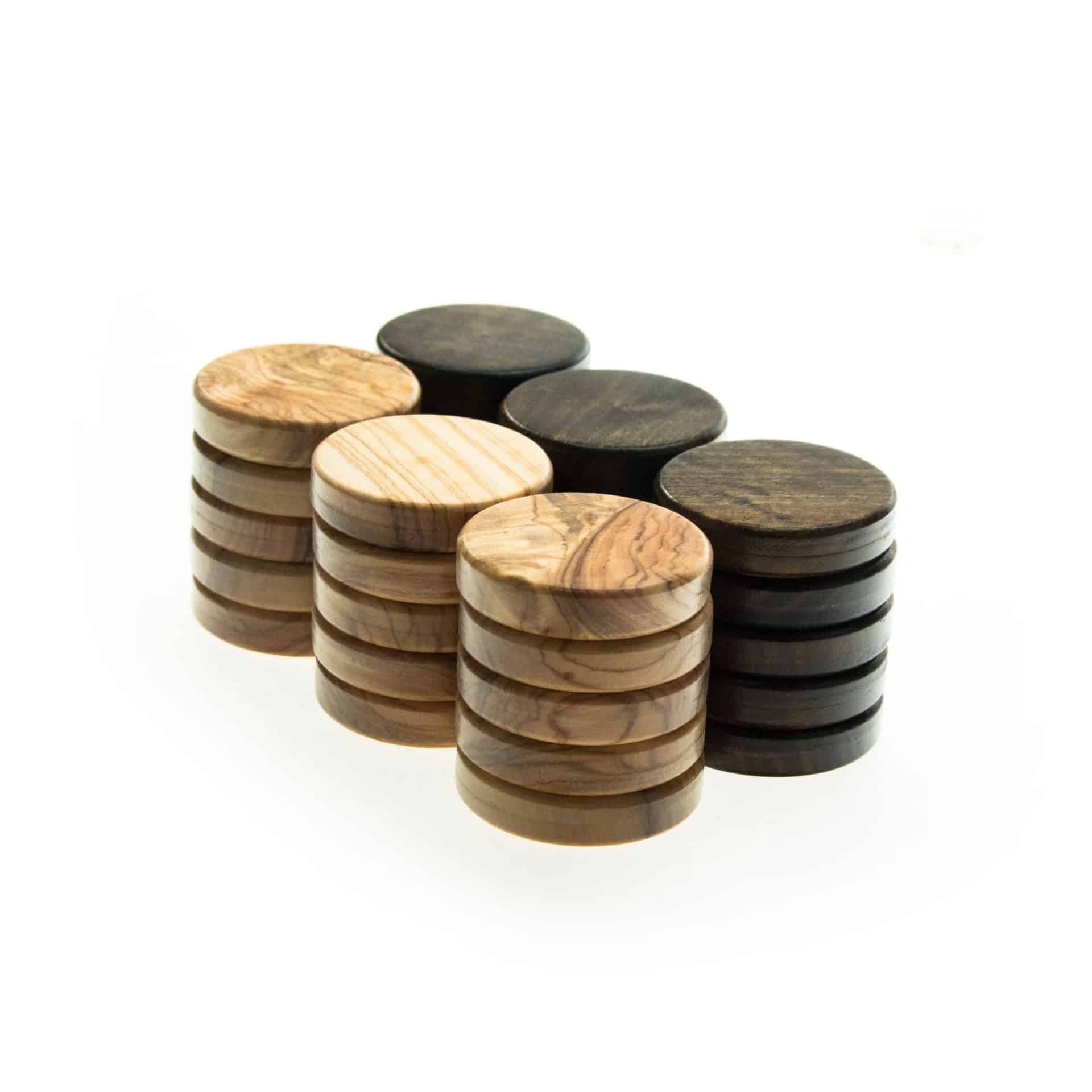 Backgammon-Steine aus Olivenholz – Set mit 30 Stück in 3 Größen (20 mm, 26 mm, 36 mm) – Farben Braun und Dunkelbraun
