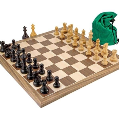 Broadbase III Set Schachbrett aus Nussbaum und Ahorn und Schachfiguren aus Buchsbaum und ebonisiertem Buchsbaum