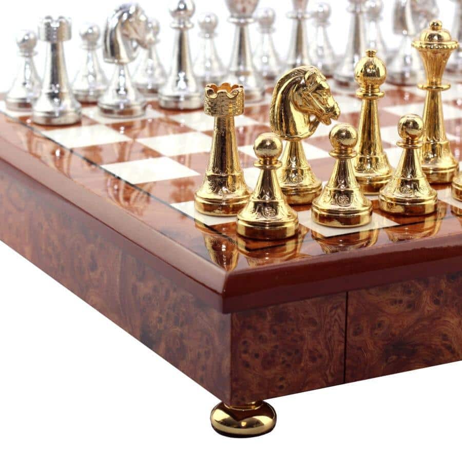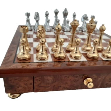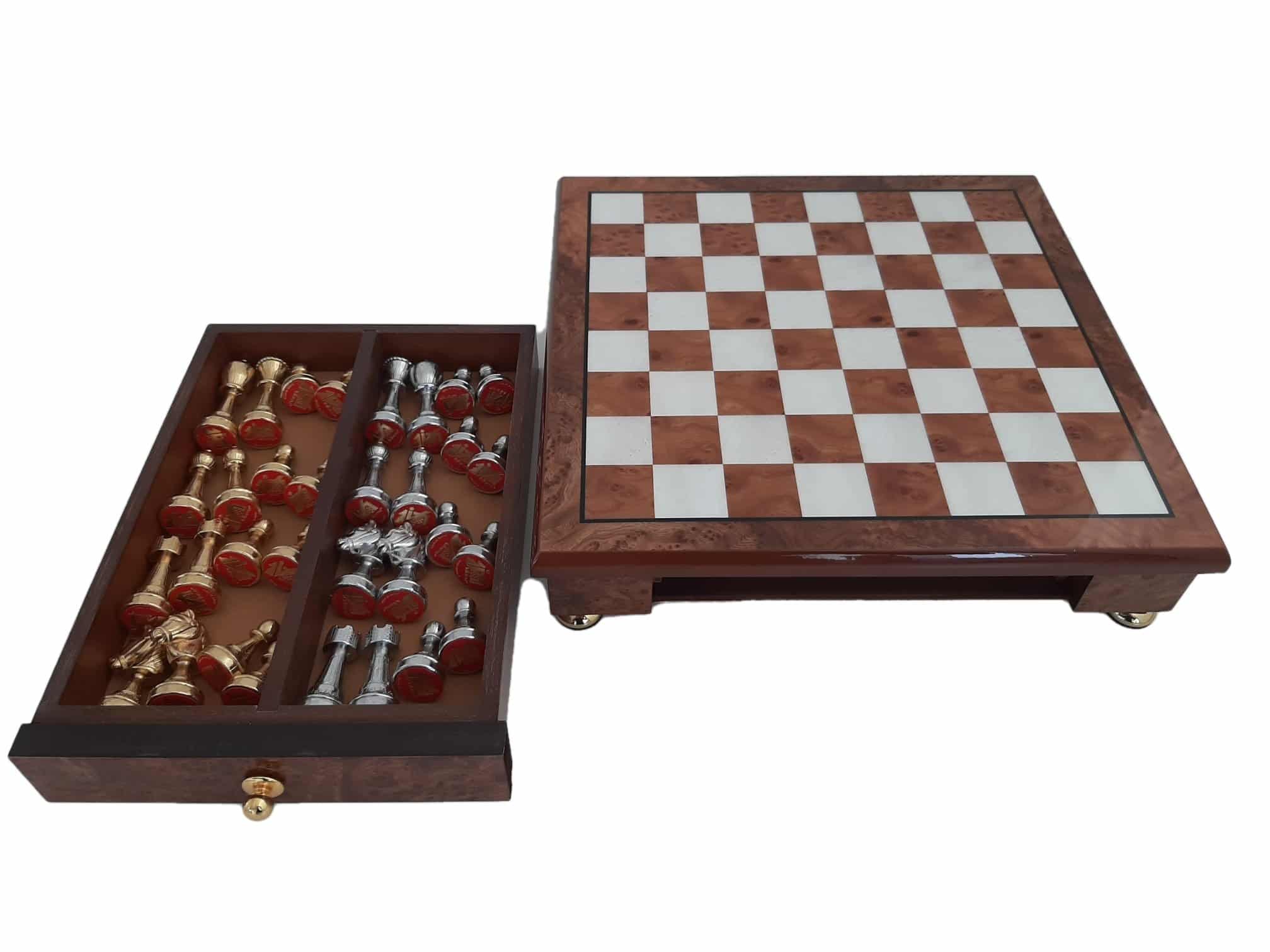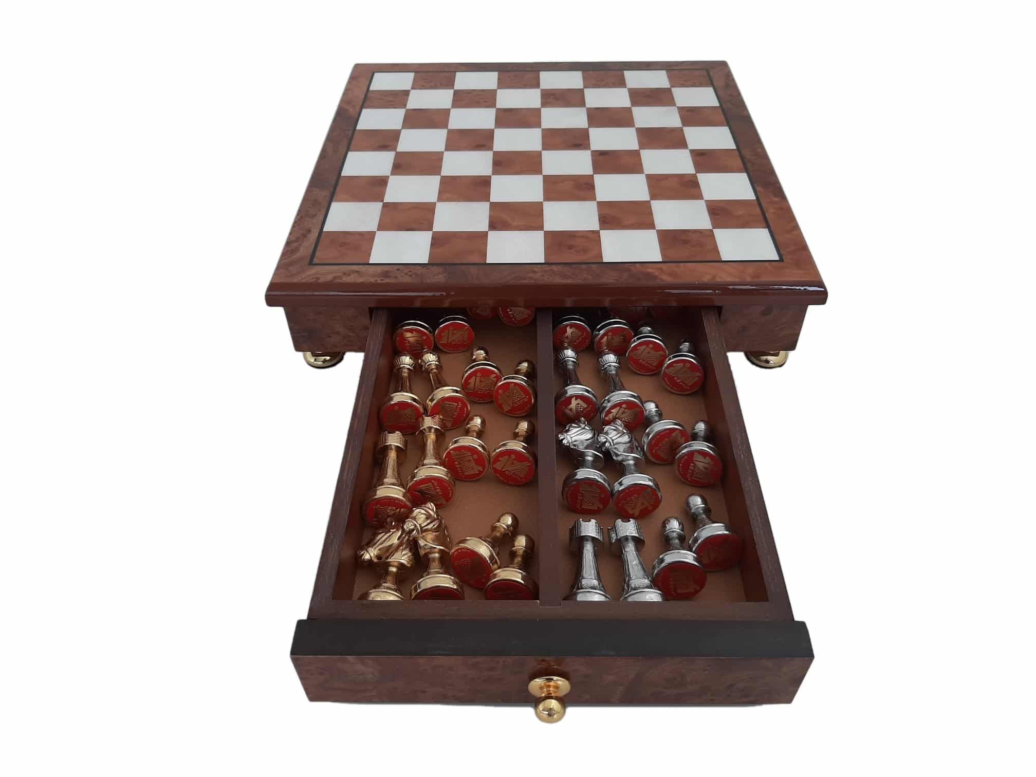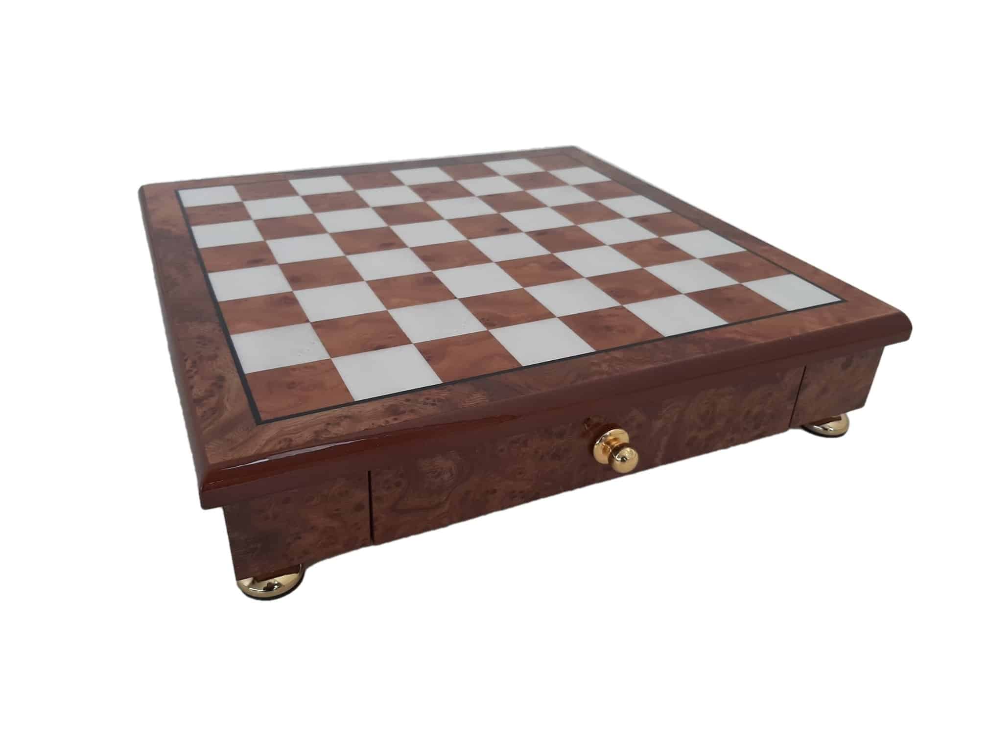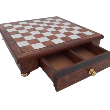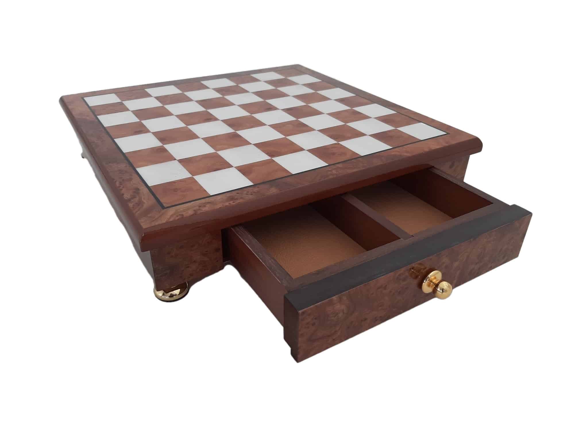 Das Schachbrett, das die Staunton-Figuren begleitet, ist ein kleines handwerkliches Schmuckstück aus Holz, das auf Messingfüßen steht, vollständig aus Ulmen- und Wurzelholz gefertigt und verfügt über eine in zwei Segmente unterteilte Aufbewahrungsschublade.