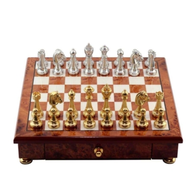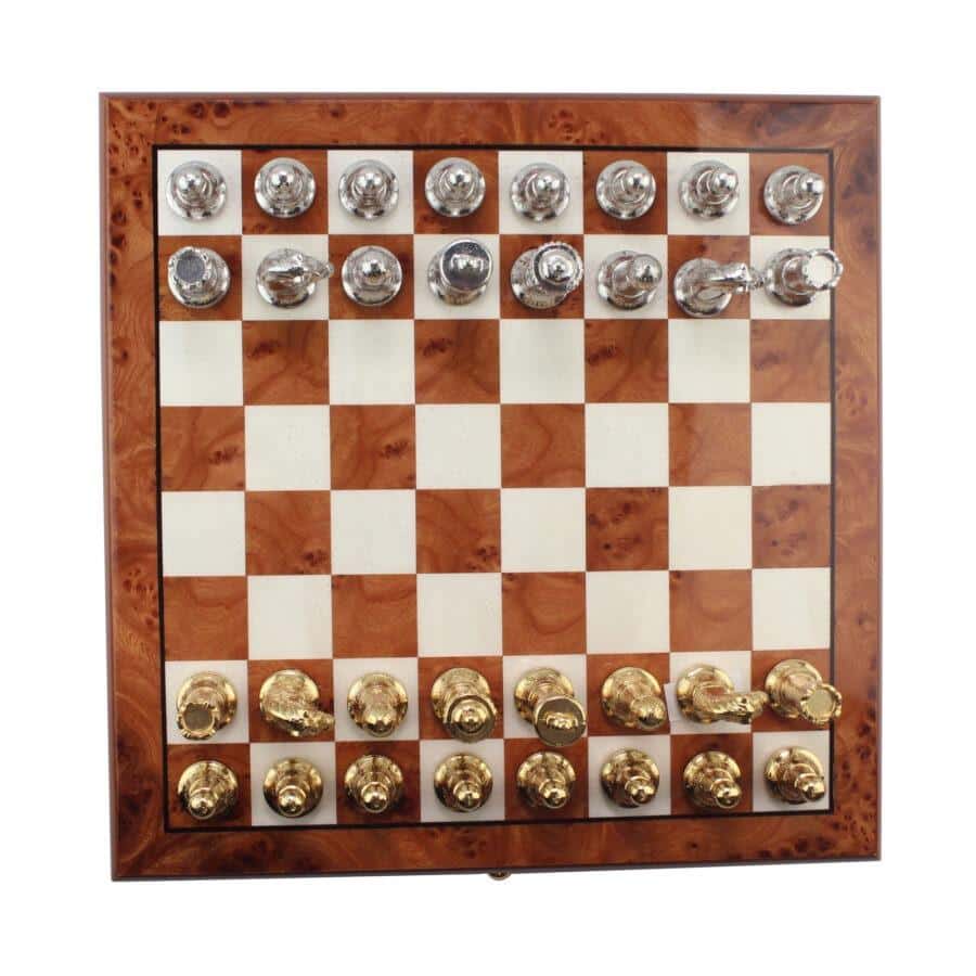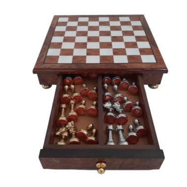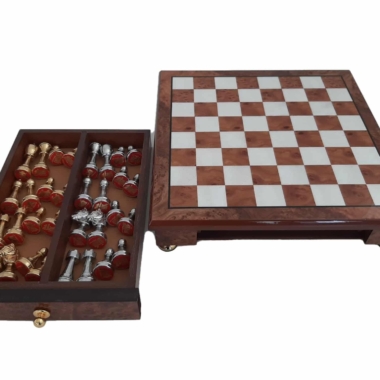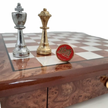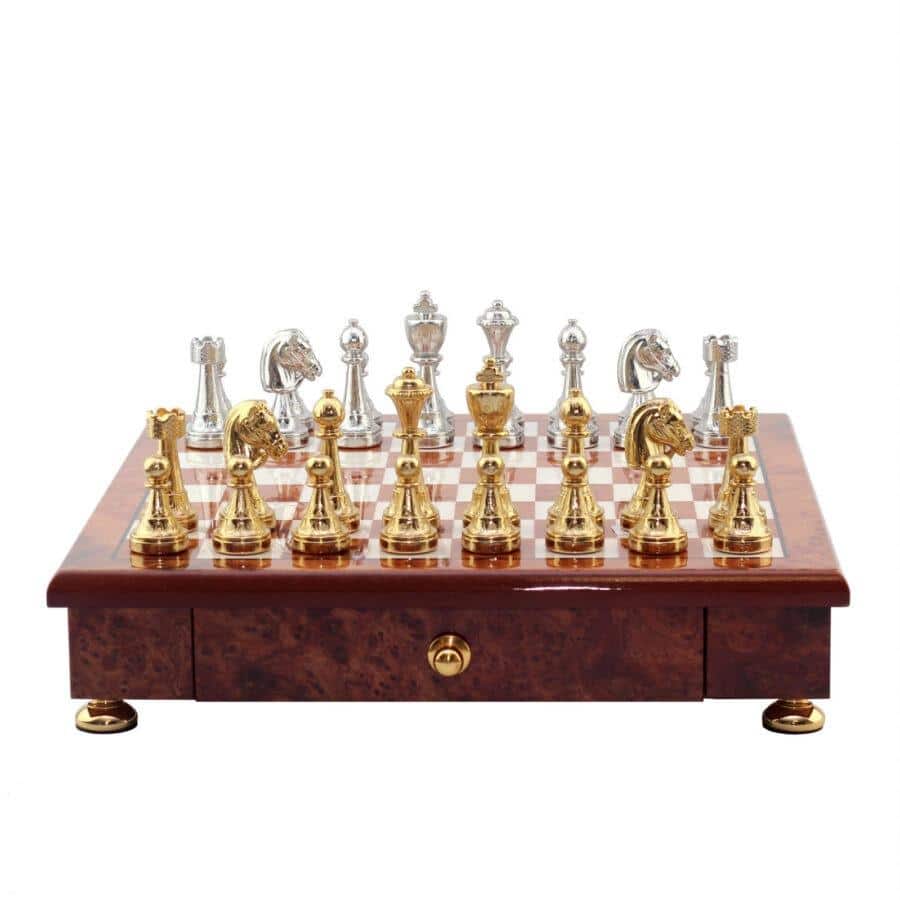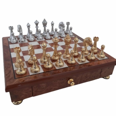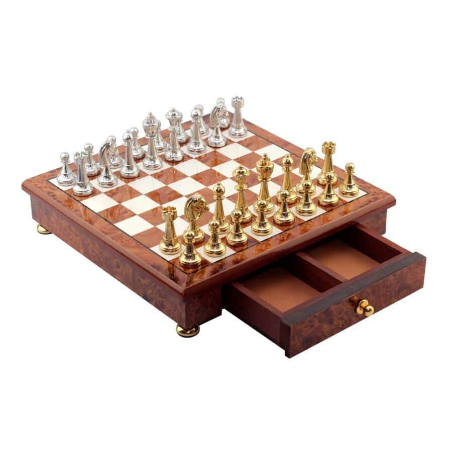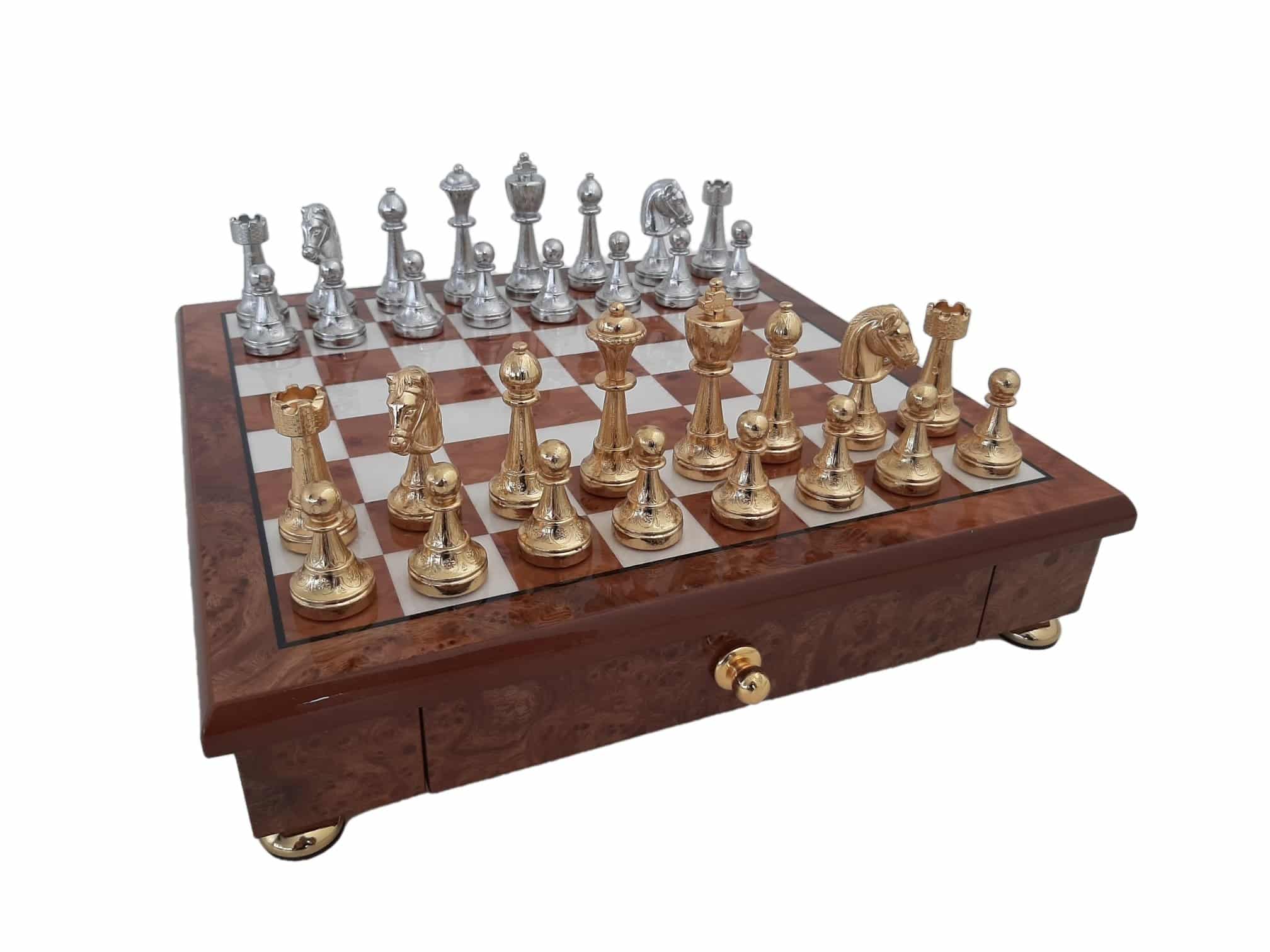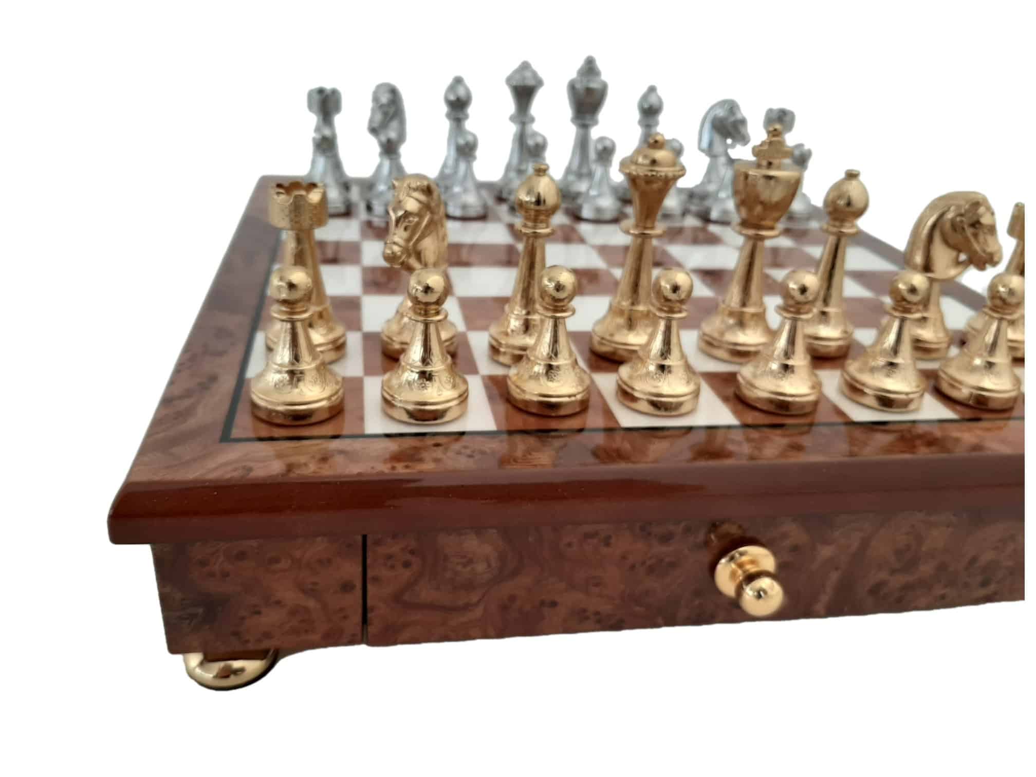 Das Schachbrett, das die Staunton-Figuren begleitet, ist ein kleines handwerkliches Schmuckstück aus Holz, das auf Messingfüßen steht, vollständig aus Ulmen- und Wurzelholz gefertigt und verfügt über eine in zwei Segmente unterteilte Aufbewahrungsschublade.