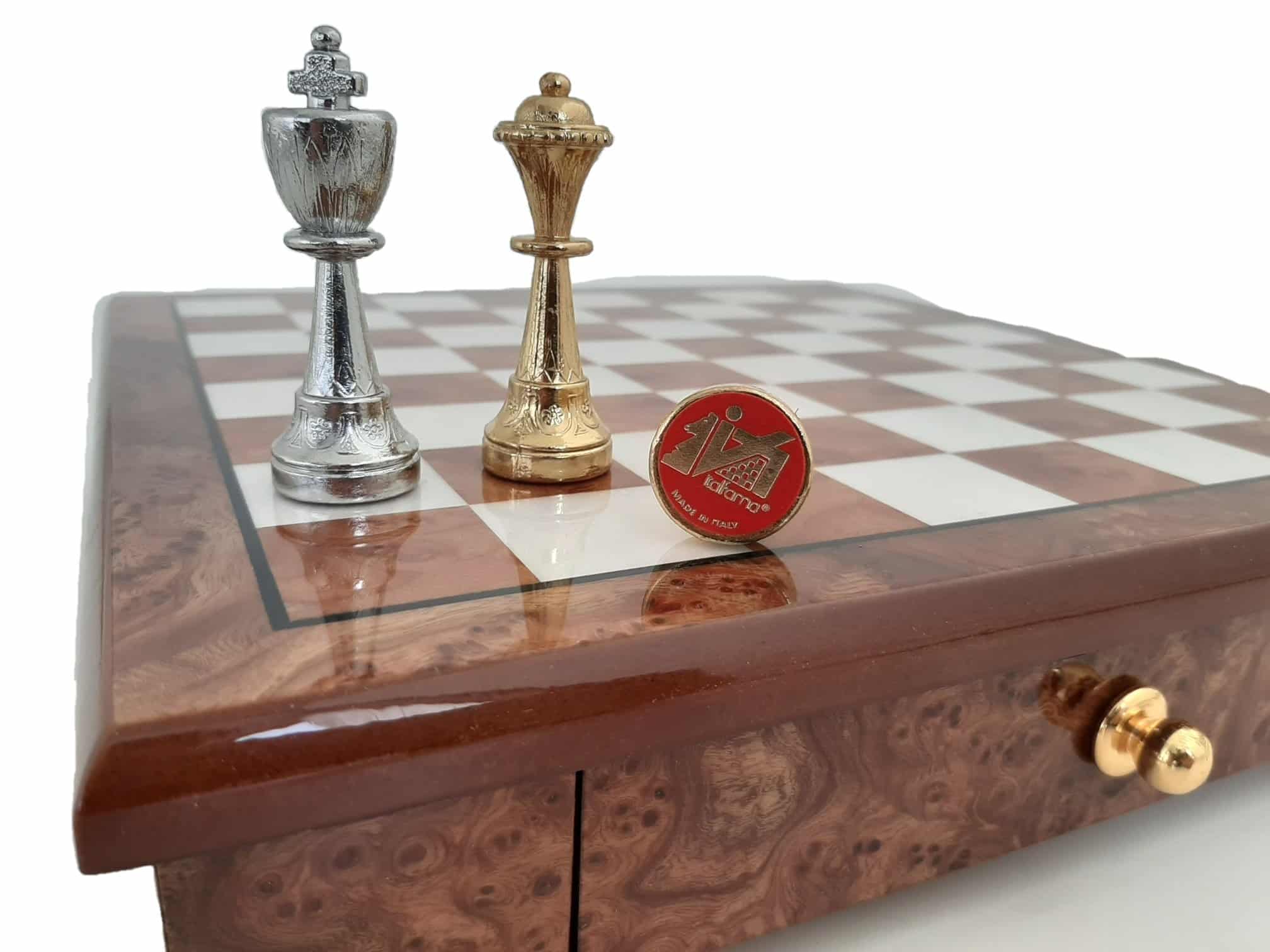 Ein hochwertiges Schachbrett- und Schachspielset, klein, aber aus edlen Materialien und mit präziser Verarbeitung. Vollständig hergestellt von einem italienischen Handwerker, der auf die Herstellung von Schachspielen und Salon-Schachbrettern spezialisiert ist. Sie können sicher sein, ein Schachspiel zu besitzen, das von Generation zu Generation weitergegeben werden kann.