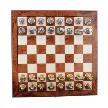 Die Figuren im Staunton-Stil haben eine Königshöhe von 7,5 cm, sie sind vollständig geschnitzt, gewichtet und von Hand poliert. Sie erforderten eine lange Arbeit an Gravuren über ihre gesamte Höhe und profitieren von einer Vergoldung und Versilberung, die die wunderschönen Gravuren und die Details der Skulptur hervorhebt.