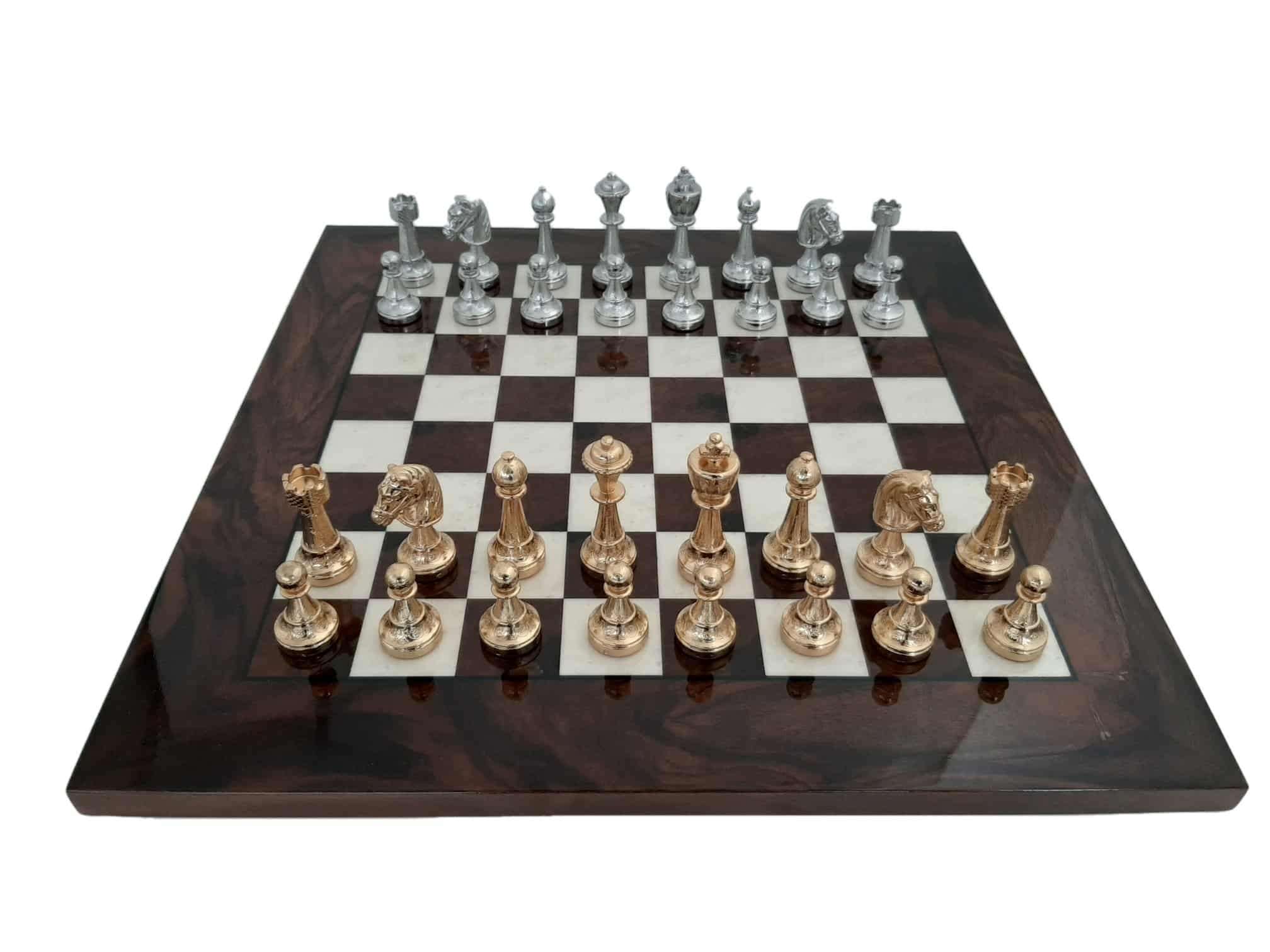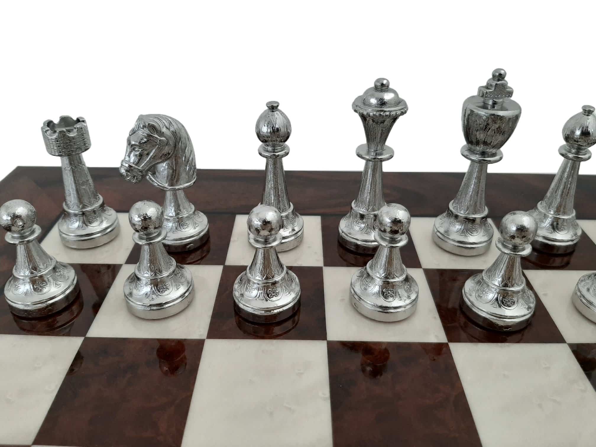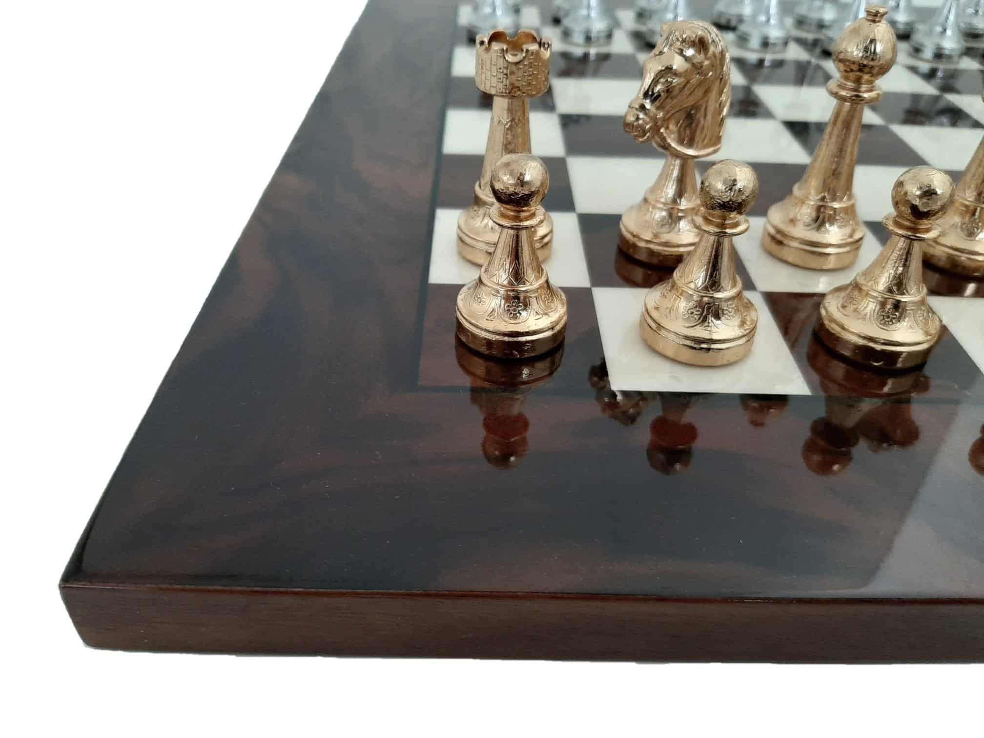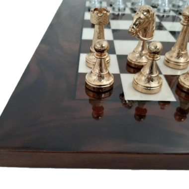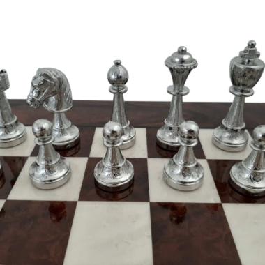 Das Schachbrett, mit 42 x 42 cm, ist aus Nussbaumwurzel gefertigt, es handelt sich um ein Holz mit sehr kontrastierenden und komplexen Maserungen auf einem dunklen Hintergrund. Es profitiert von einer Lackierung, die dieses Holz, das für seine Ästhetik so geschätzt wird, noch mehr zur Geltung bringt.