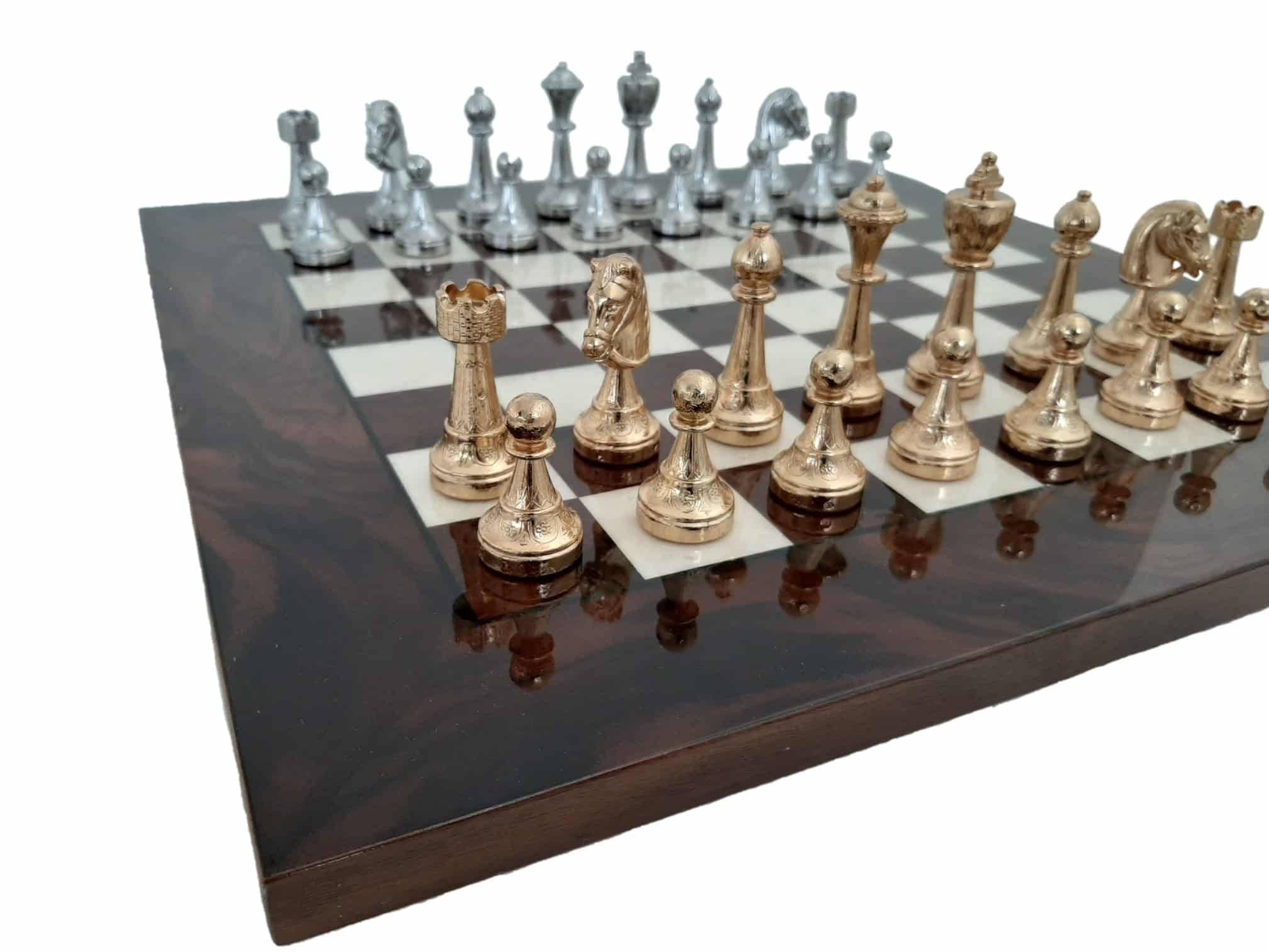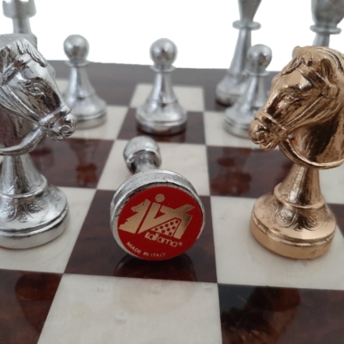 Das dunkle Holzschachbrett hebt die Schönheit der gold- und silberplattierten Schachfiguren hervor. Ein wunderschönes Set aus Salon-Schachspiel, hergestellt von einem Handwerker, der auf die Herstellung von Schachspielen spezialisiert ist und mit dem wir seit Jahren zusammenarbeiten, das Ihr Interieur bereichern und beim Spielen sehr angenehm zu handhaben sein wird.