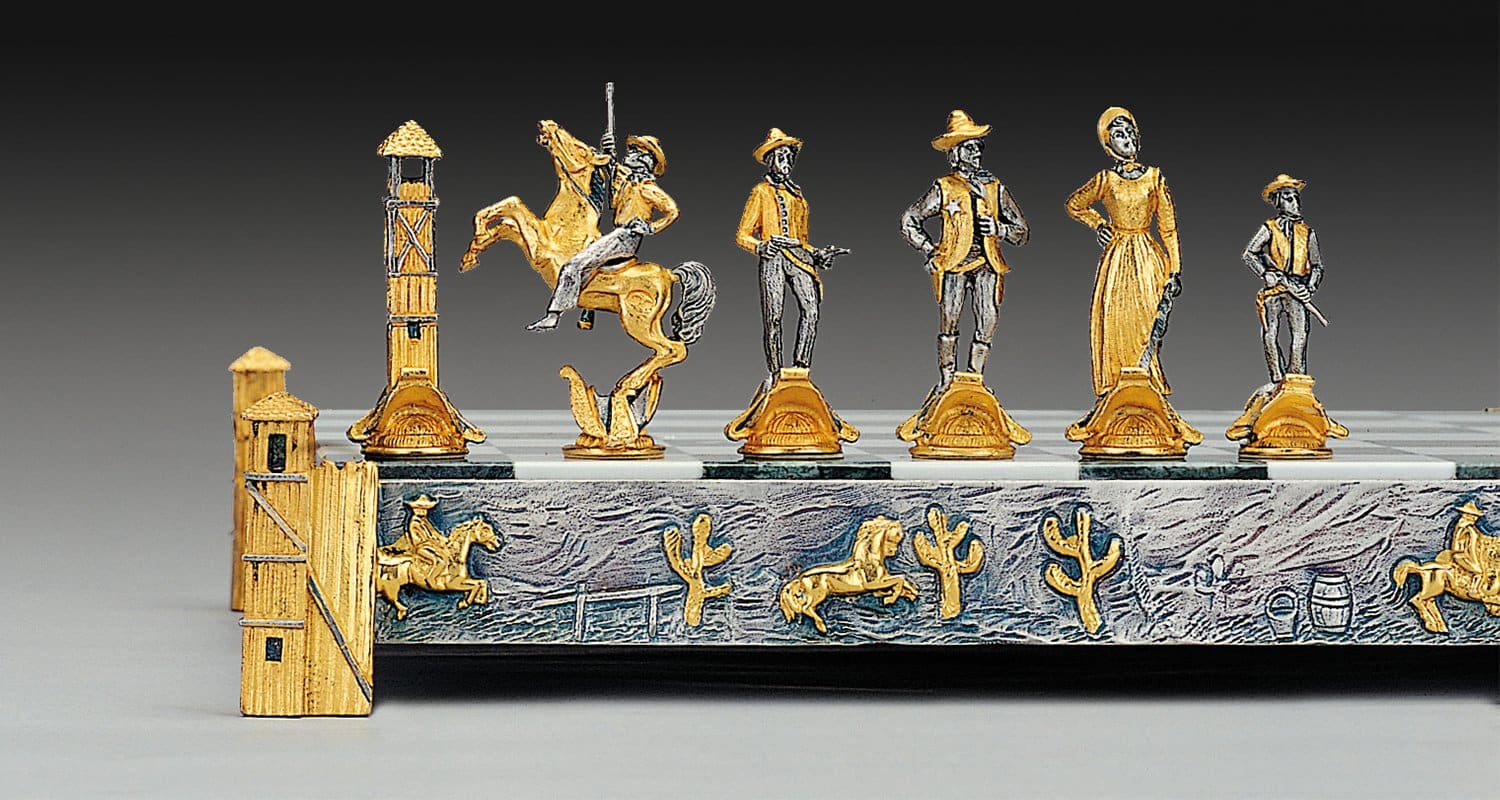 Oberfläche : 24 Karat Gold. Die Füße des Schachbretts sind in Form von Wachtürmen des Wilden Westens gestaltet.