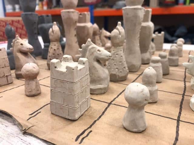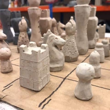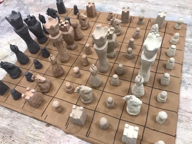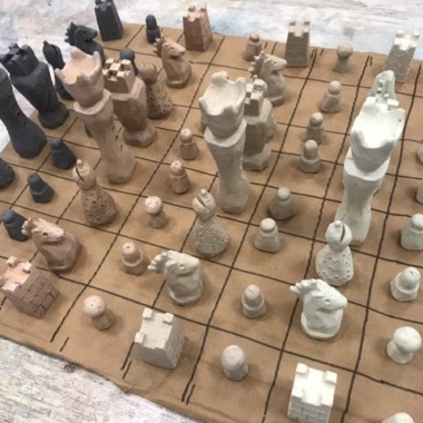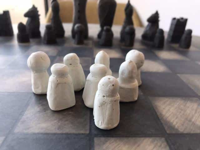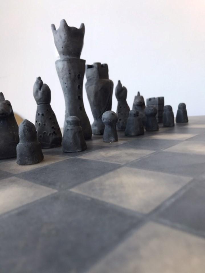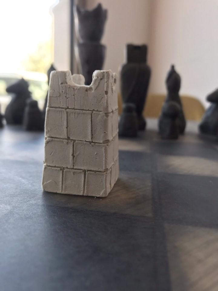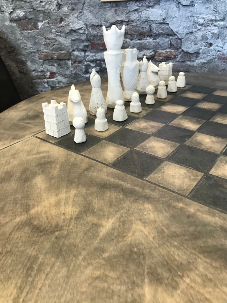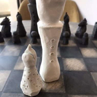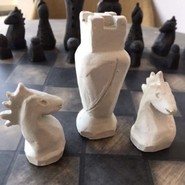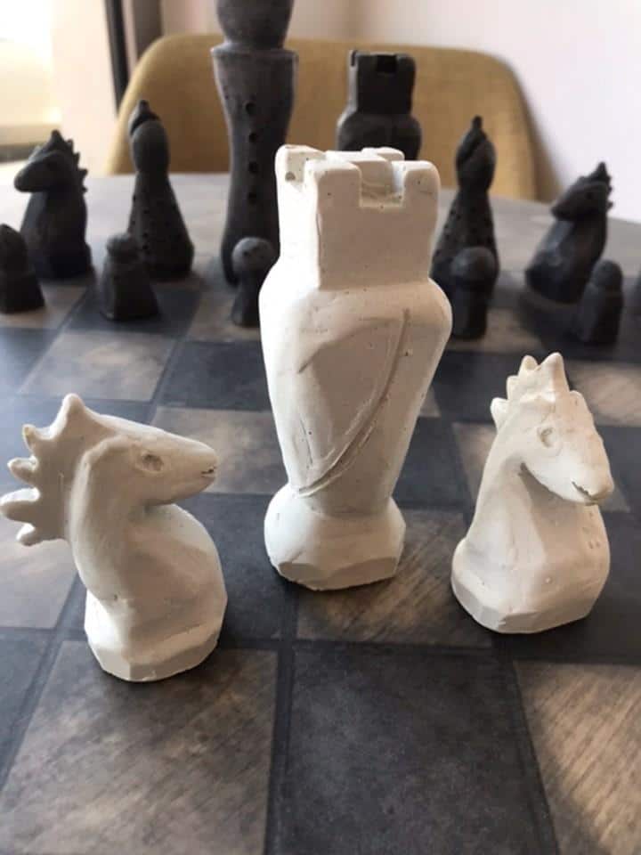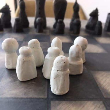 Die Schachfiguren sind aus Zement gefertigt, indem sie in eine Form gegossen werden, und werden dann mit einem ersten Lack geschützt, um die Figuren auf den zweiten Lack aus pflanzlichem Öl vorzubereiten. Sie verfügen über eine Filzunterlage an der Basis, um das Spielbrett bei der Handhabung nicht zu beschädigen.
