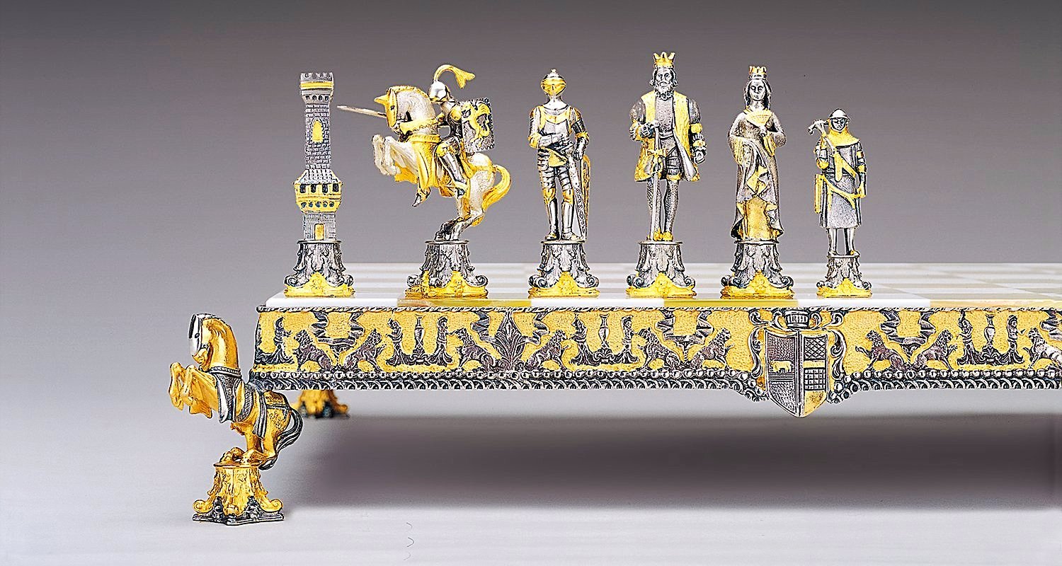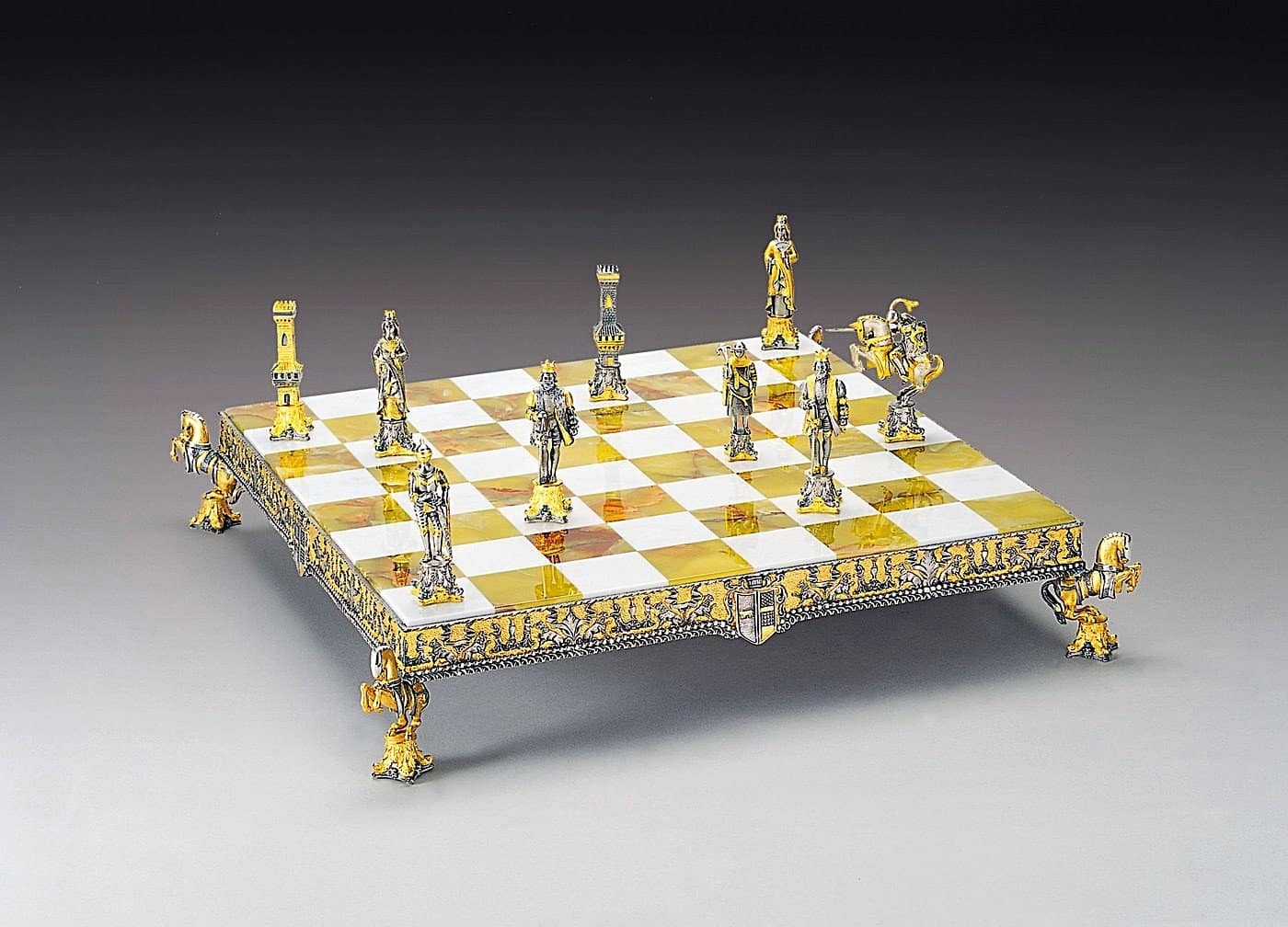 Oberfläche : 24 Karat Gold. Die Füße des Schachbretts sind in Form von Pferden skulptiert.