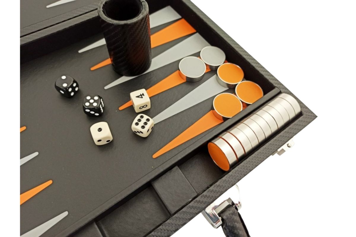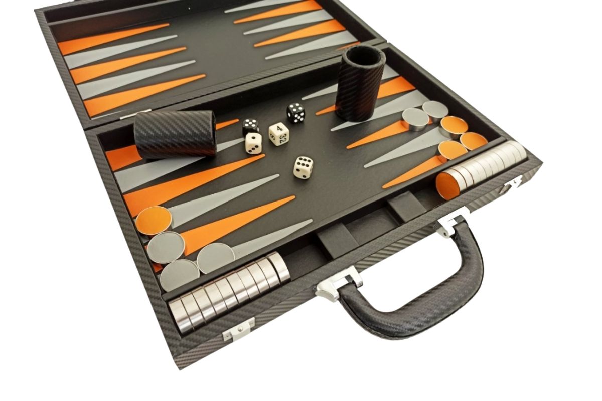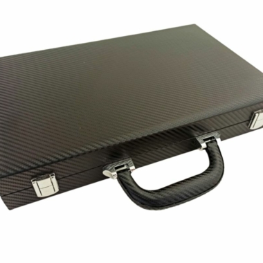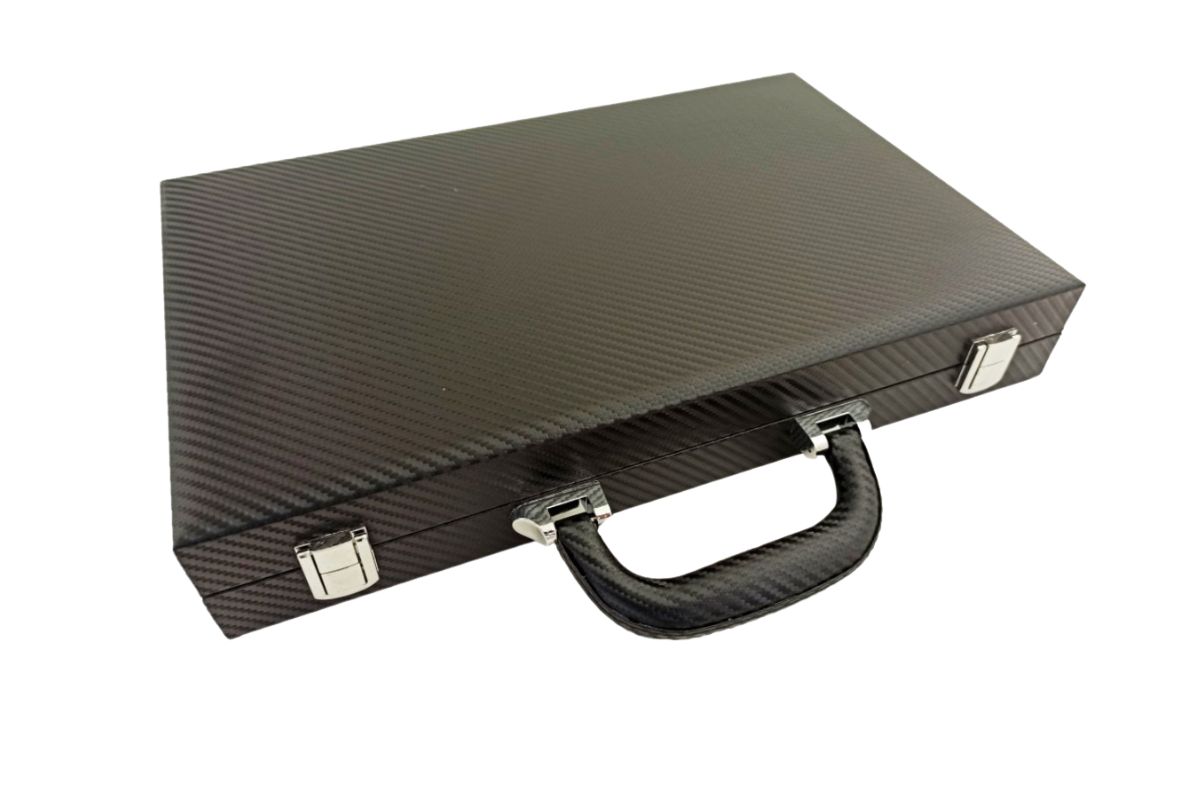 Faltbares Backgammon-Set aus hochwertigem Kunstleder. Die Abmessungen von 37 x 48 x 5 cm (Spielbrettgröße) machen dieses Set ideal für unterwegs.