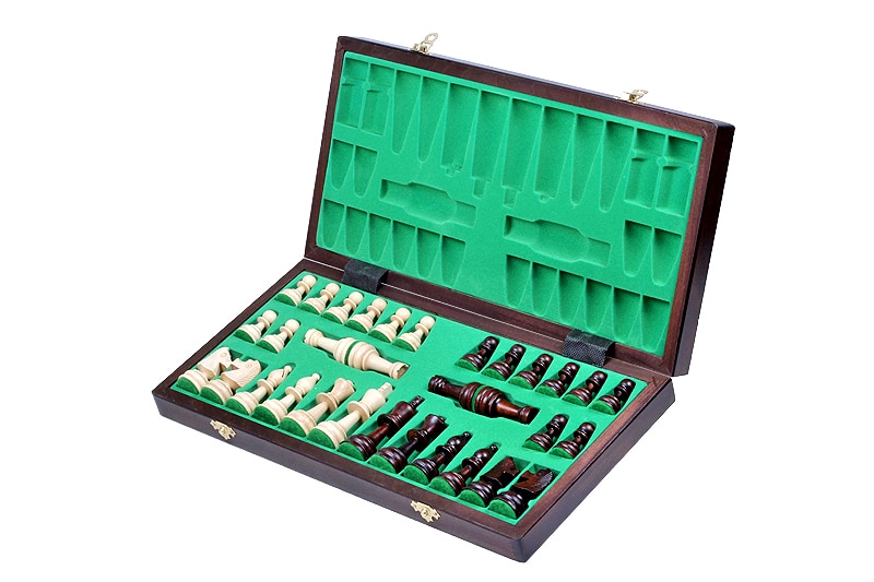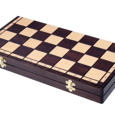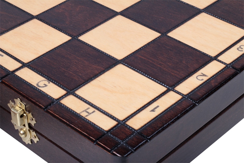 Faltbares Schachbrett mit alphanumerischen Koordinaten und Aufbewahrung sowie Schachfiguren aus Holz