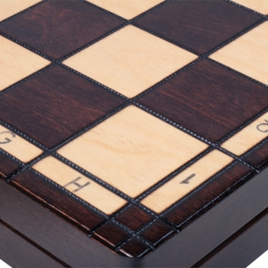 Das faltbare Schachbrett verfügt über einen Aufbewahrungsraum für die Schachfiguren im Inneren. Es ist aus Birkensperrholz und Buchenholz hergestellt und hat eine Größe von 42 x 42 x 2,5 cm geöffnet (42 x 21 x 5 cm geschlossen).
