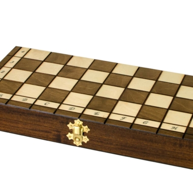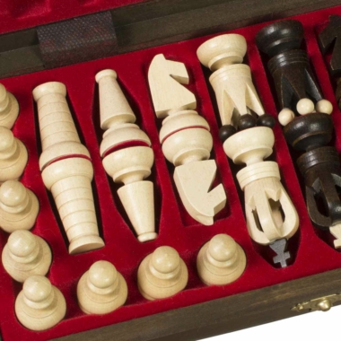 Dank seiner Abmessungen, mit einem Schachbrett aus Buchen- und Birkenholz von 31 x 31 x 2,25 cm (31 x 15,5 x 4,5 cm geschlossen) kann das Spiel als Reise-Schachspiel verwendet werden.