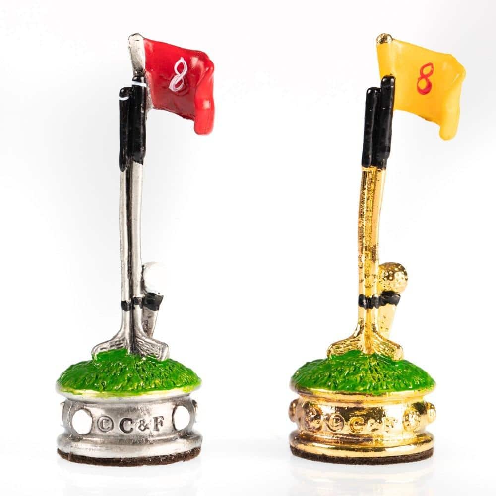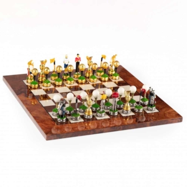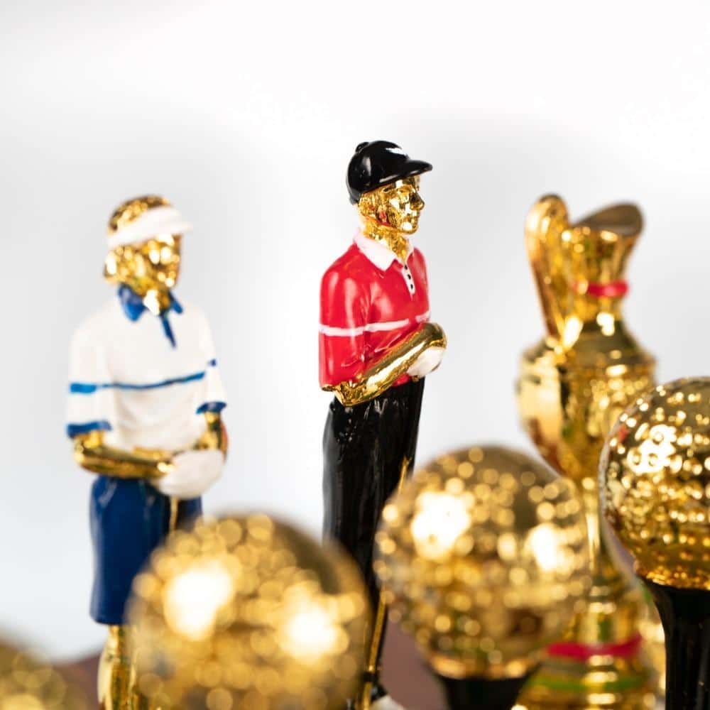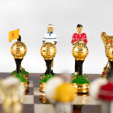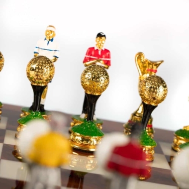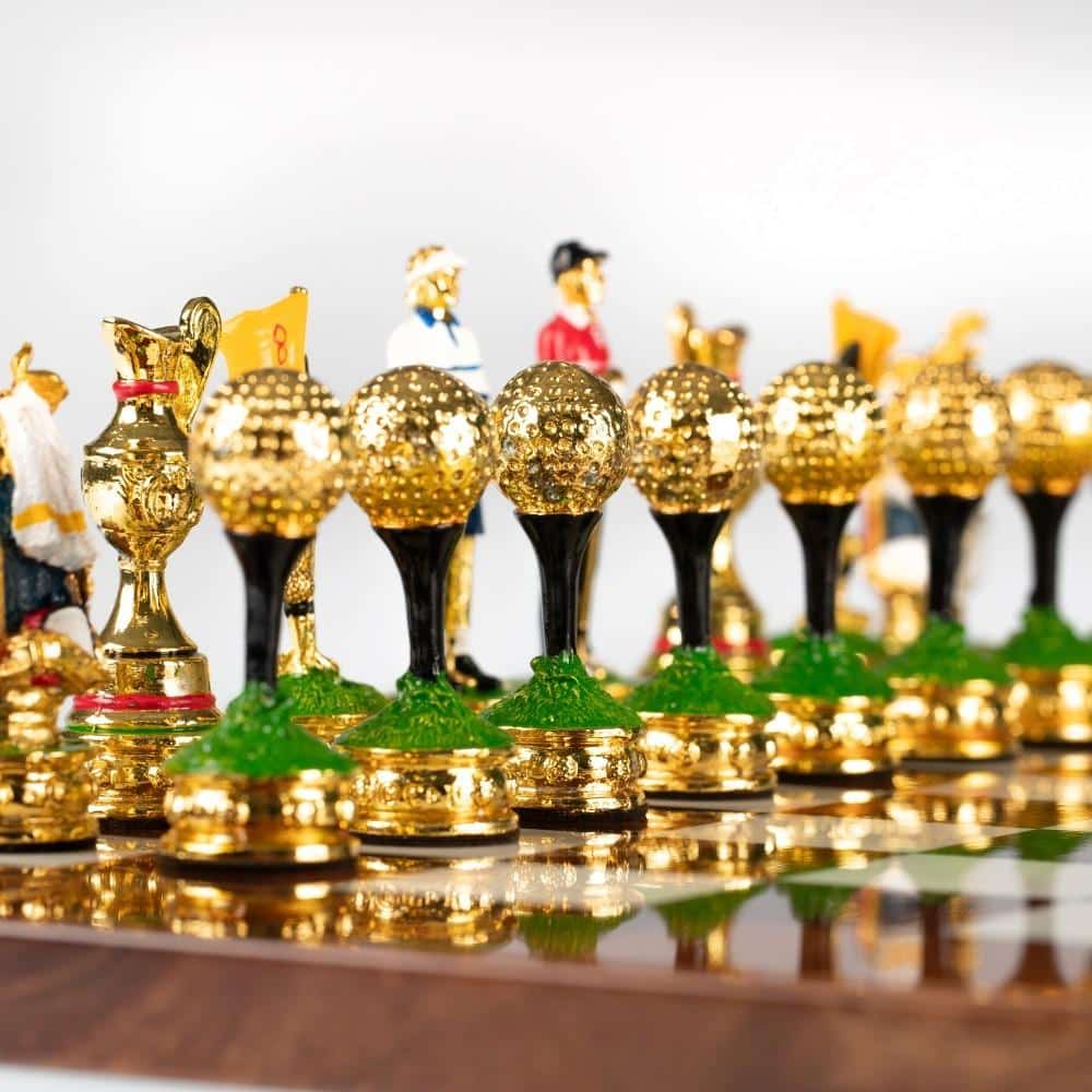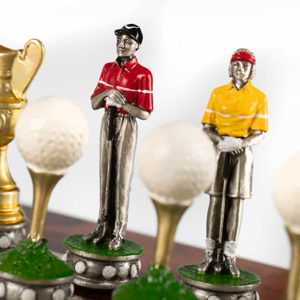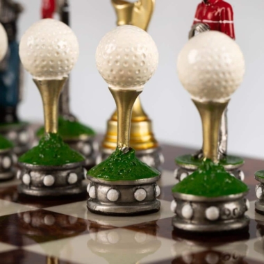 Die Schachfiguren, im Golf-Thema, sind aus Zinn und vollständig von Hand bemalt, eine für die Gestaltung von Schachspielen spezialisierte Handwerker.