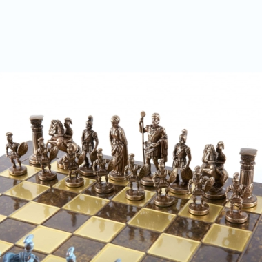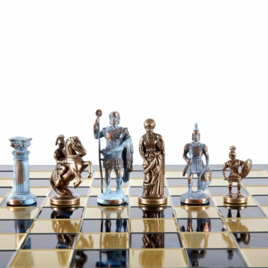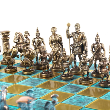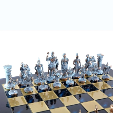 Griechisch-Römisches Schachspiel-Set aus Metall – Bronze- und Blaustücke mit Metall-Schachbrett 44 x 44 cm und Aufbewahrungskoffer