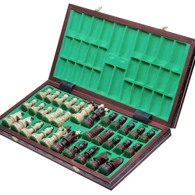 Große dekorative Schachfiguren aus Holz und faltbares Schachbrett mit Aufbewahrung