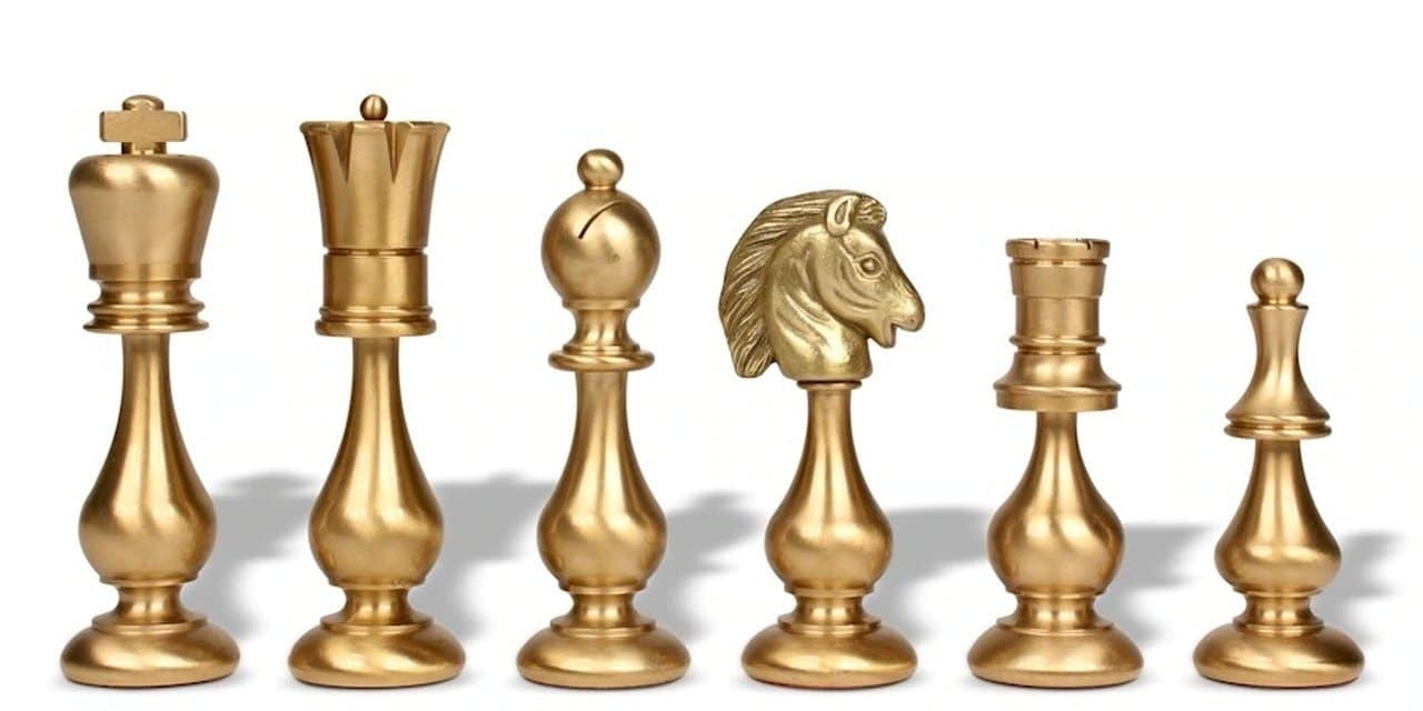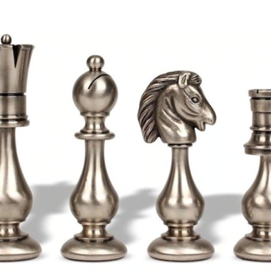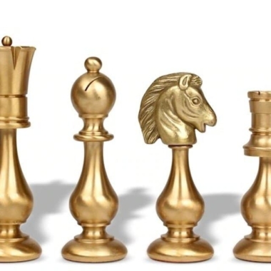 Es wird ergänzt durch große Schachfiguren, die vollständig von Hand aus Messing gefertigt sind. Ihr Design ist inspiriert vom Staunton-Stil, jedoch moderner gestaltet.