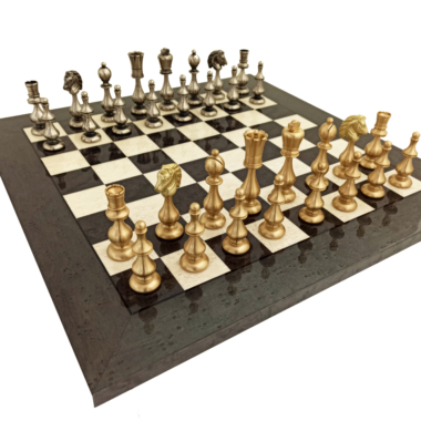 Grandes Schachspiel Design – Schachfiguren aus Messing und Schachbrett aus Wurzelholz und lackiertem Ahorn