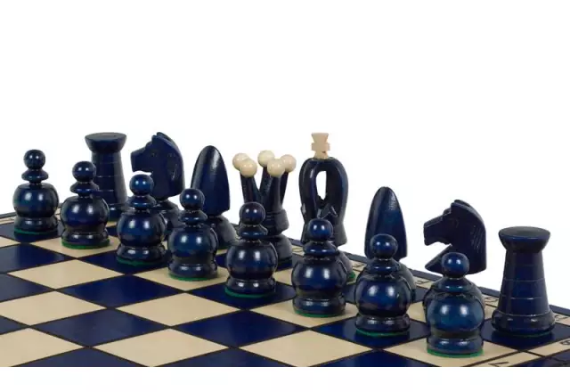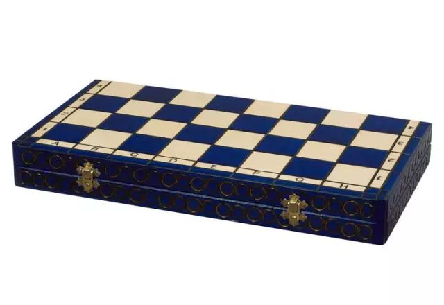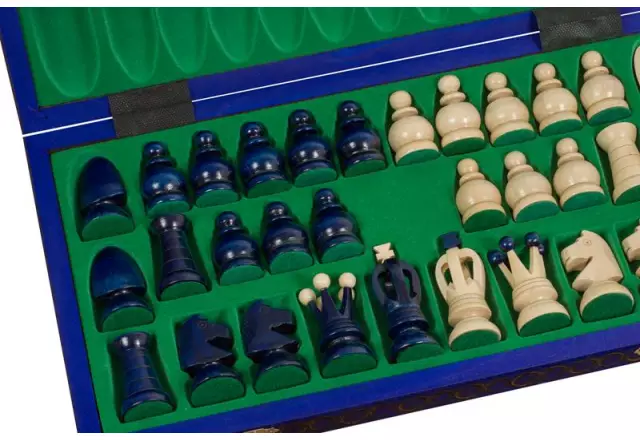 Großes faltbares Schachspiel aus Holz in Blau mit Aufbewahrung 44 x 44 cm