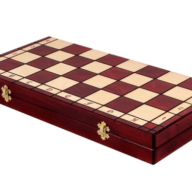 Das Schachbrett ist klappbar und besteht aus Birkensperrholz und Buchenholz. Mit einer Größe von 50 x 50 x 3 cm offen (50 x 25 x 6 cm geschlossen) umfasst es zwei Fächer zur Aufbewahrung der Schachfiguren im Inneren.
