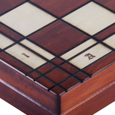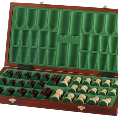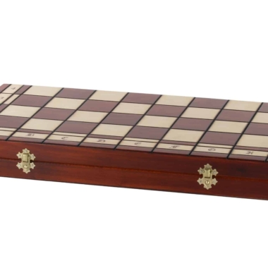 Das klappbare Schachbrett aus Buche und Birke hat eine Größe von 55 x 55 x 3,5 cm geöffnet (55 x 27,5 x 7 mm geschlossen). Es verfügt über ein Fach unter dem Spielbrett zur Aufbewahrung der Schachfiguren im Inneren.
