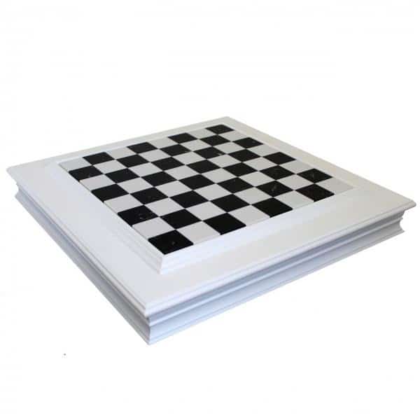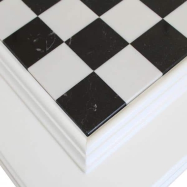 Das Schachbrett hat die Maße 50 x 50 cm und besteht aus Marmor und lackiertem Holz mit einem profilierten Rahmen. Die weiße Oberfläche harmoniert mit dem wunderschönen Schachbrett aus schwarz-weißem Marmor. Das Marmorbrett lässt sich anheben, um ein individuelles Aufbewahrungsfach für jede Figur zu zeigen.