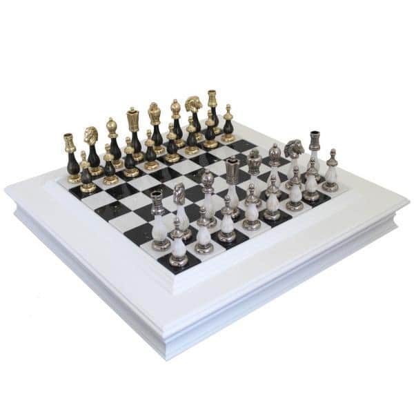 Schachspiel aus Holz und Schwarz-Weiß-Metall & Schachbrett aus Marmor und lackiertem Holz mit Aufbewahrung
