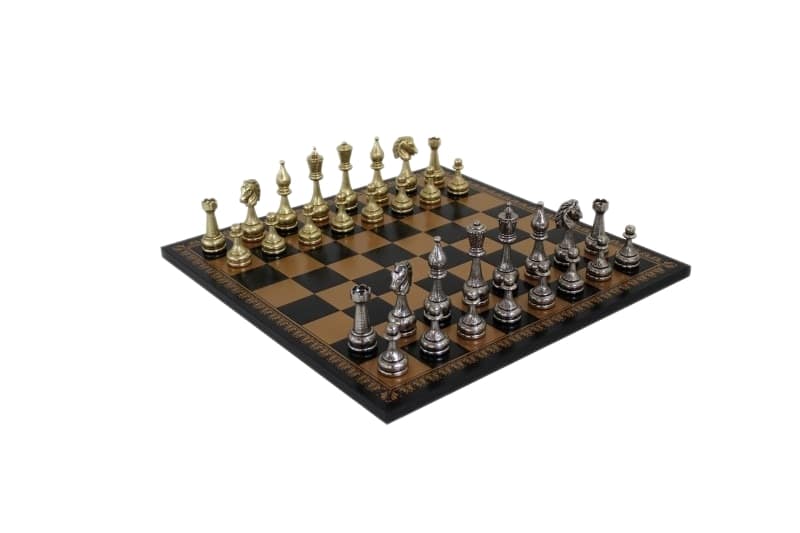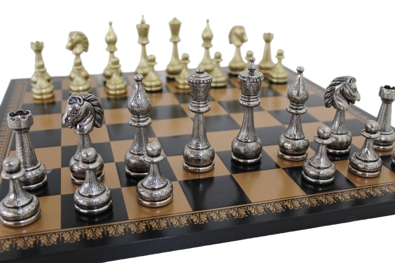 Großes Schachspiel aus skulptiertem Metall & Schachbrett aus schwarzem und goldenem Kunstleder
