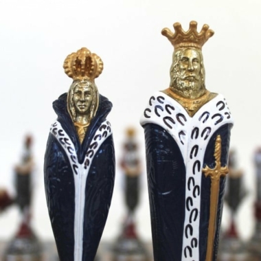 Die Schachfiguren sind aus Metall im italienischen Renaissance-Thema gefertigt. Vollständig handgeschnitzt und handbemalt sind sie gut gewichtet. Mit einer Könighöhe von 13,8 cm ist es ein echtes Vergnügen, sie auf dem Schachbrett zu bewegen.