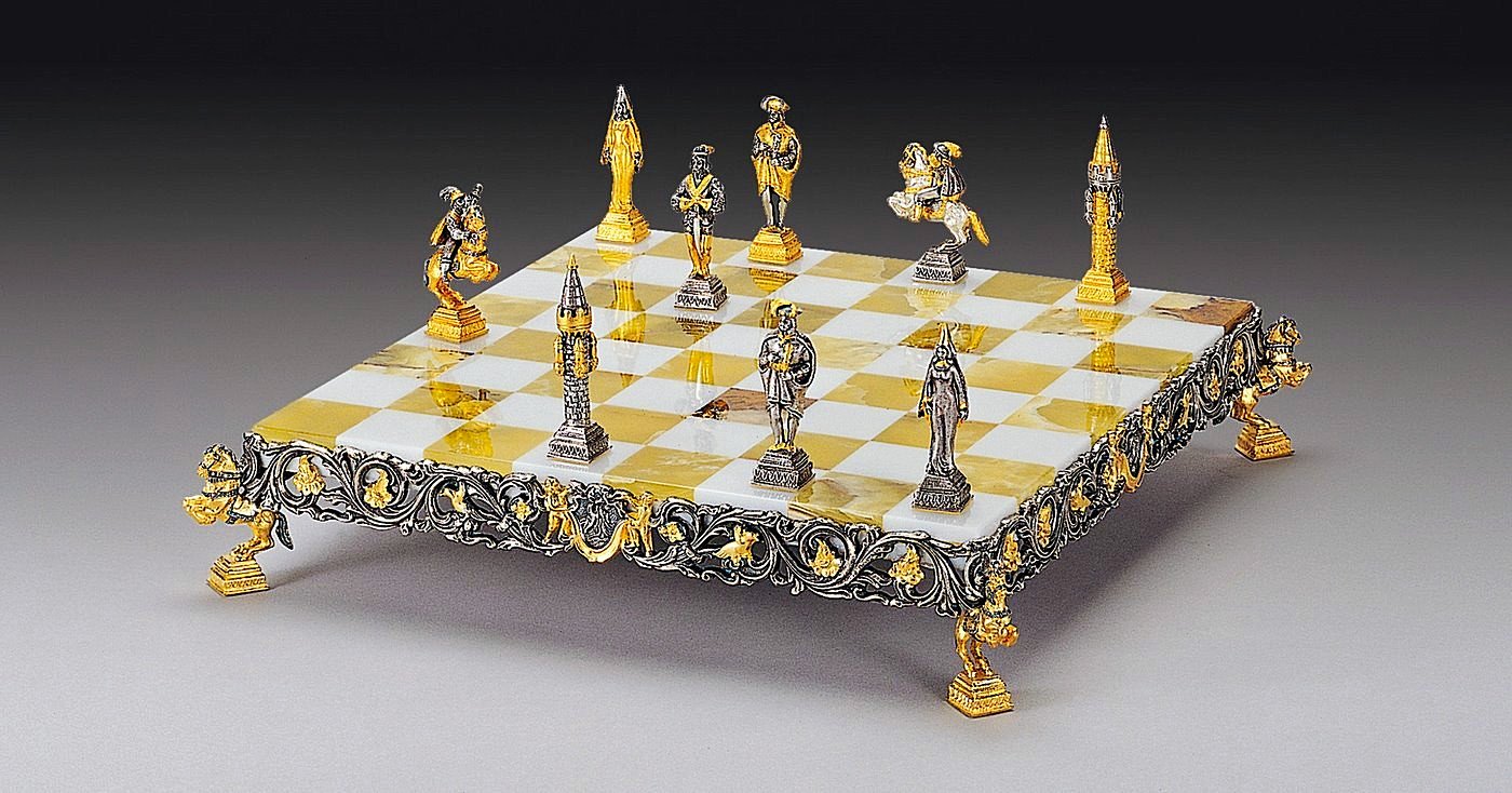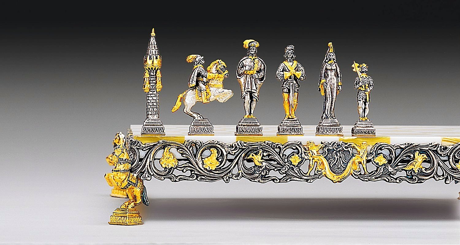 Oberfläche : 24 Karat Gold. Die Füße des Schachbretts sind in Form von kleinen Pferden skulptiert.