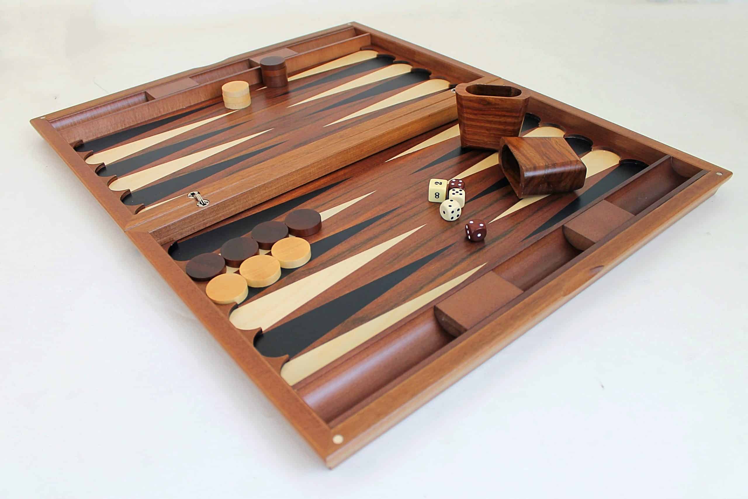 Ein Backgammonspiel original durch die Auswahl des verwendeten Holzes, Eukalyptus, das ein hellrosanes bis hellbraunes Holz ist.