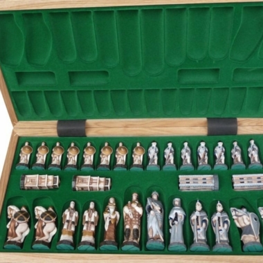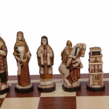 Ein Schachspielset bestehend aus handbemalten Harzfiguren mit einem mittelalterlichen Thema, sie haben eine Könighöhe von 13,5 cm.