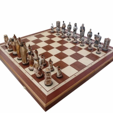 Ein Schachspielset bestehend aus handbemalten Harzfiguren mit einem mittelalterlichen Thema, sie haben eine Könighöhe von 13,5 cm.
