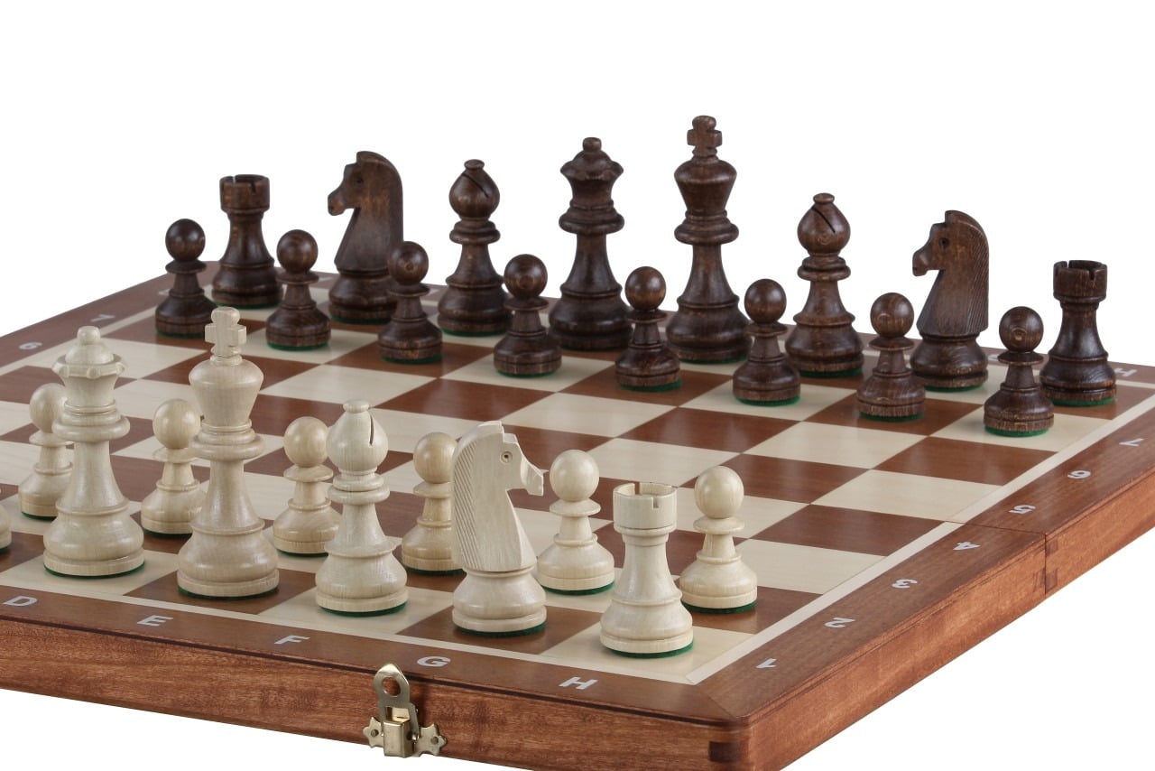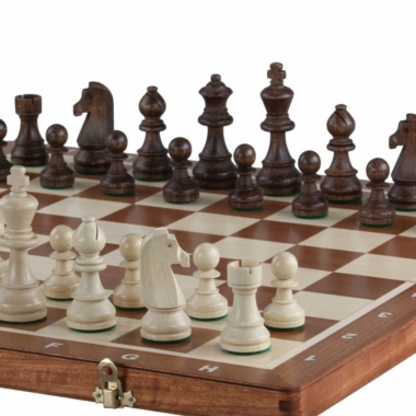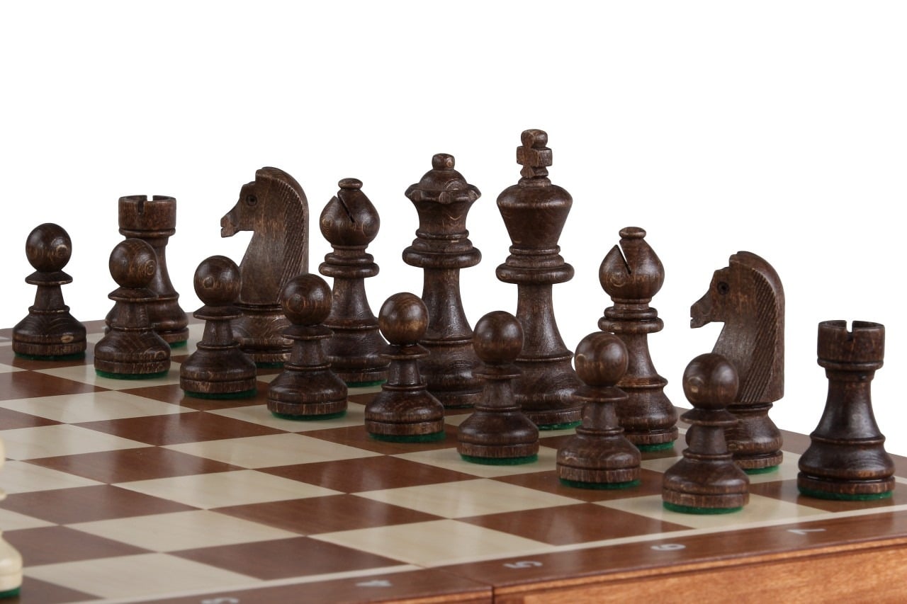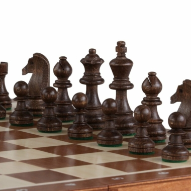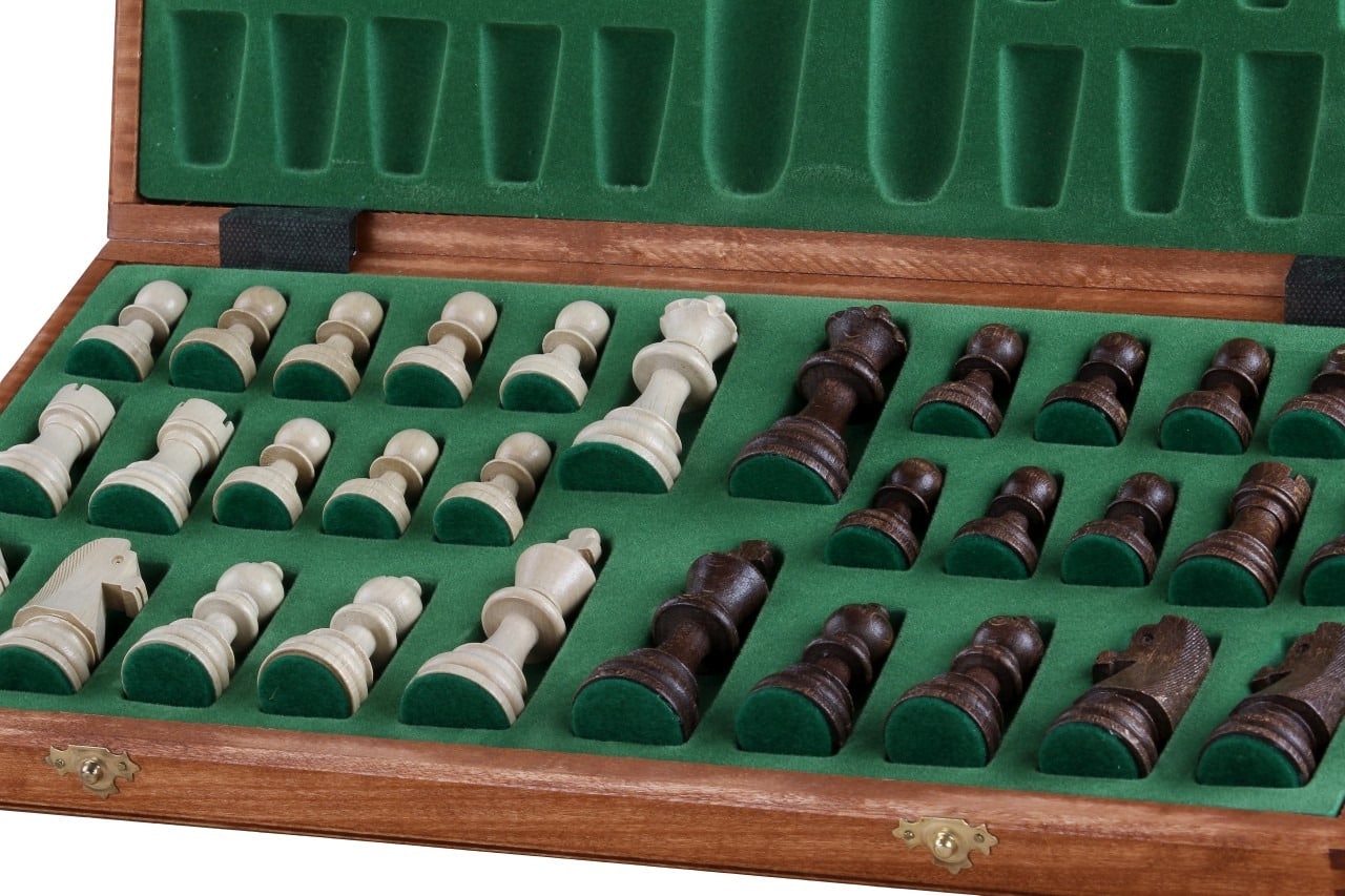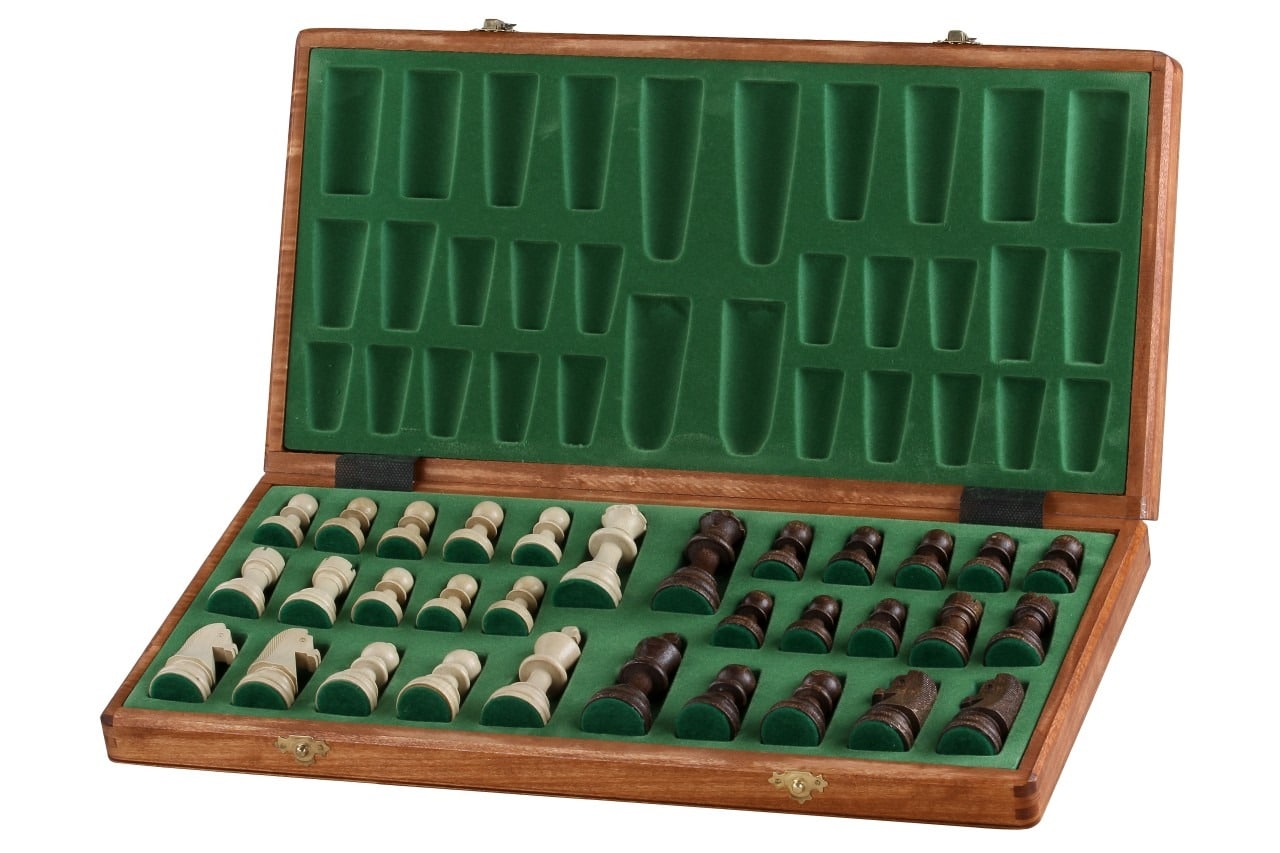 Es wird begleitet von Schachfiguren aus Holz mit einer Könighöhe von 9 cm, gut gewichtet, angenehm zu handhaben.