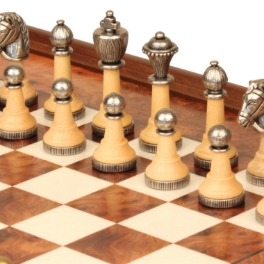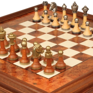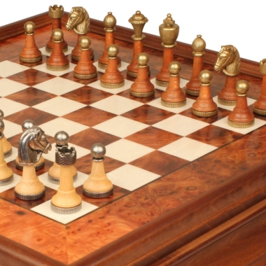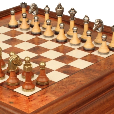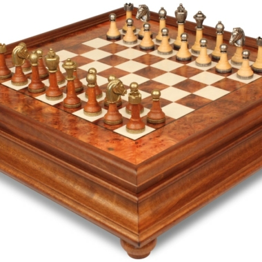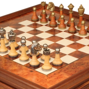 Klassisches Schachspiel – Schachbrett aus Erlenholz und Wurzelholz mit Schublade & Figuren aus Metall und Holz