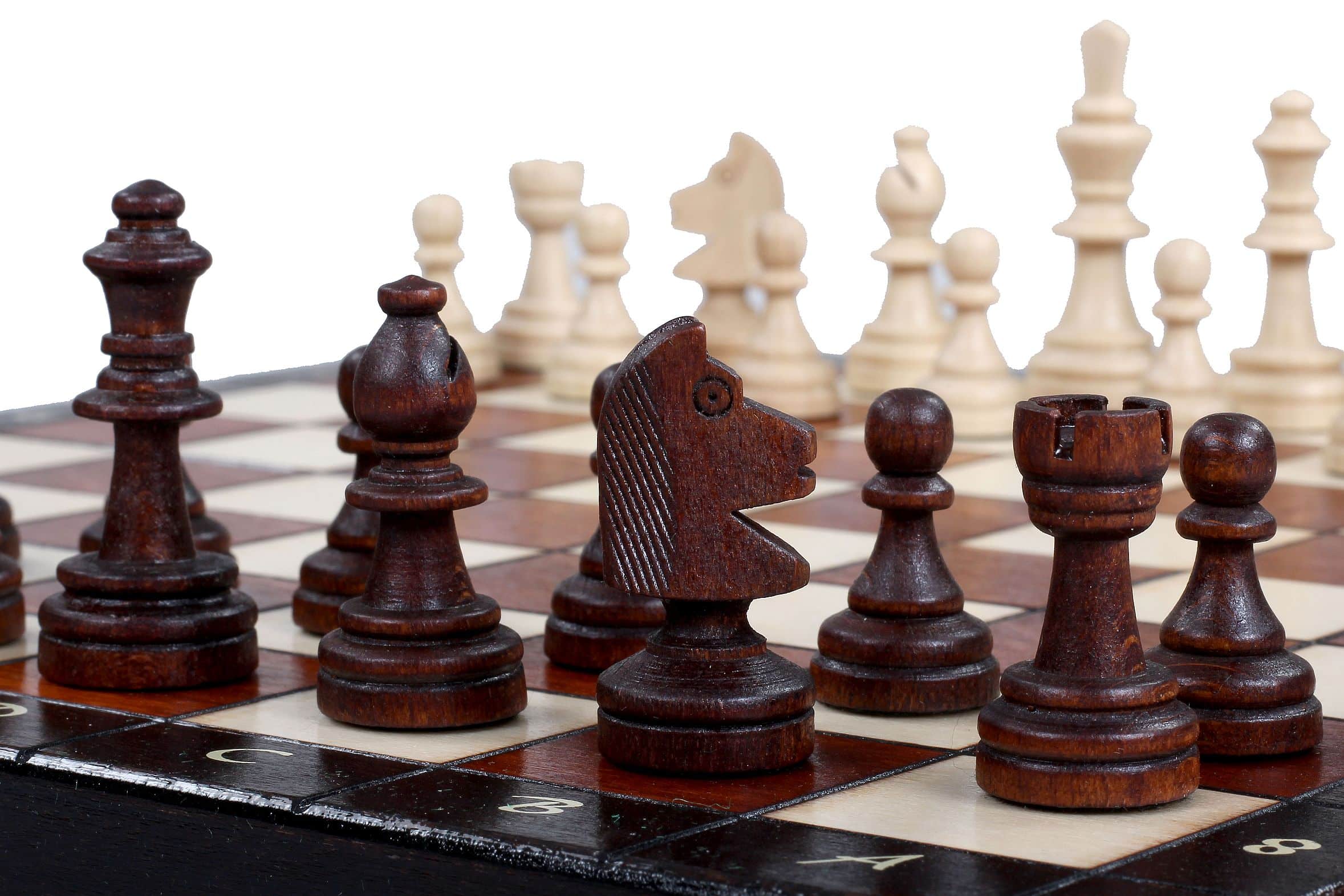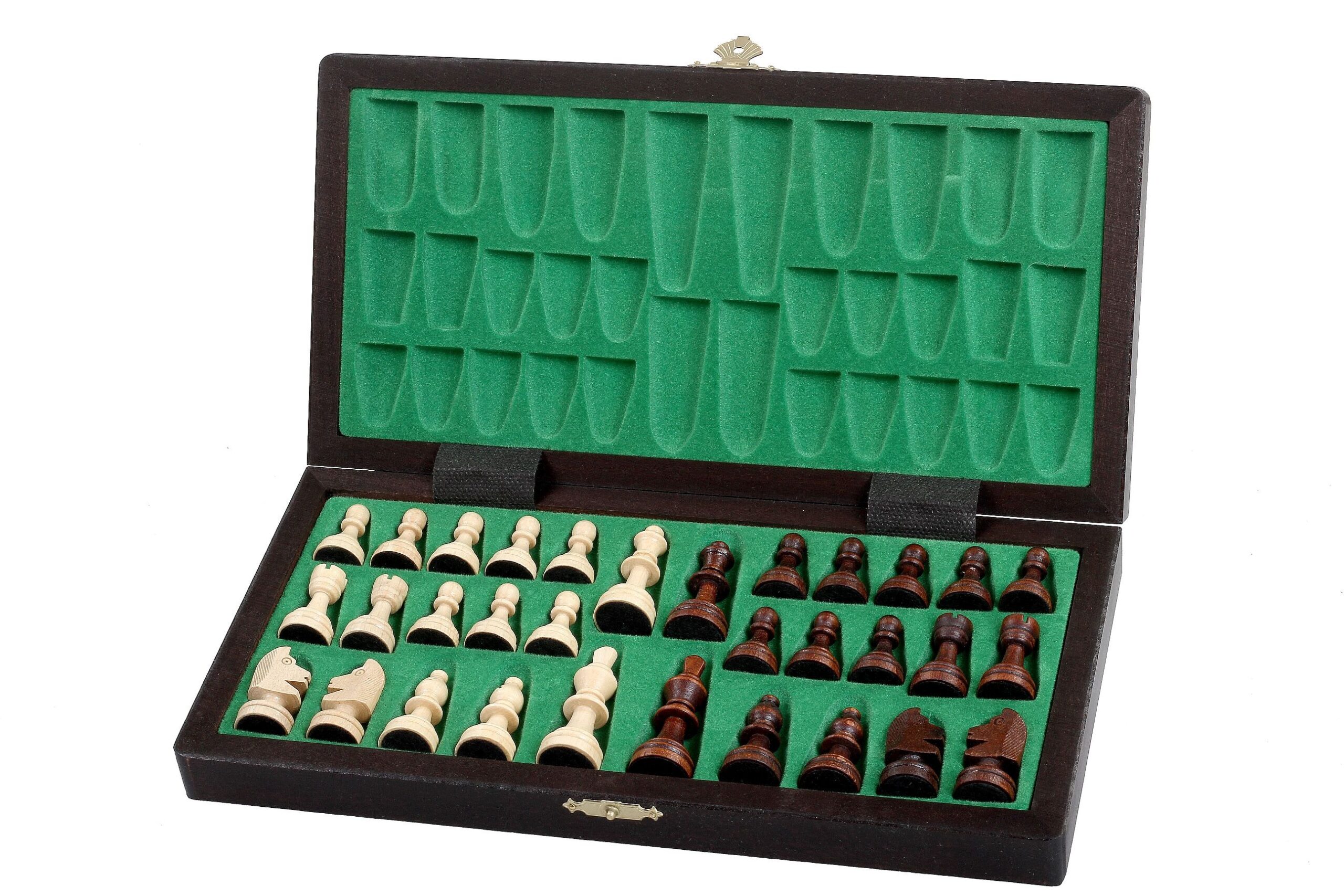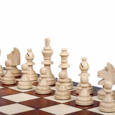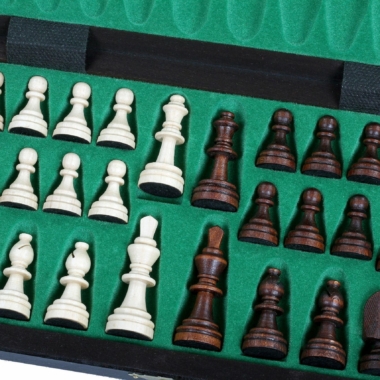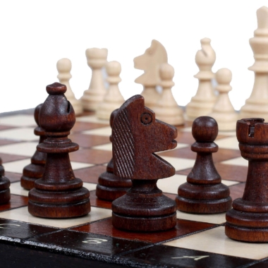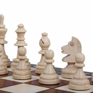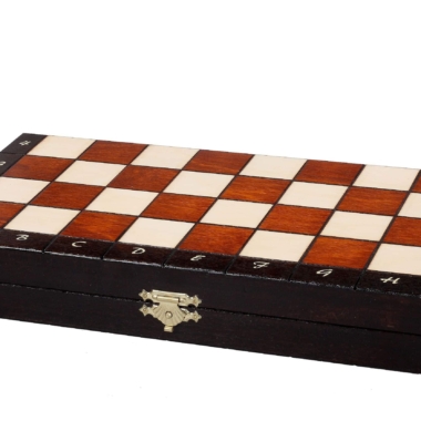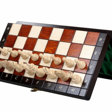 Ein kleines Schachspiel aus Holz, bestehend aus einem faltbaren und alphanumerischen Schachbrett aus Buchen- und Birkenholz mit den Maßen 28 x 28 x 2 cm offen (28 x 14 x 4 cm gefaltet). Es beinhaltet ein individuelles Aufbewahrungsfach für jedes Stück.