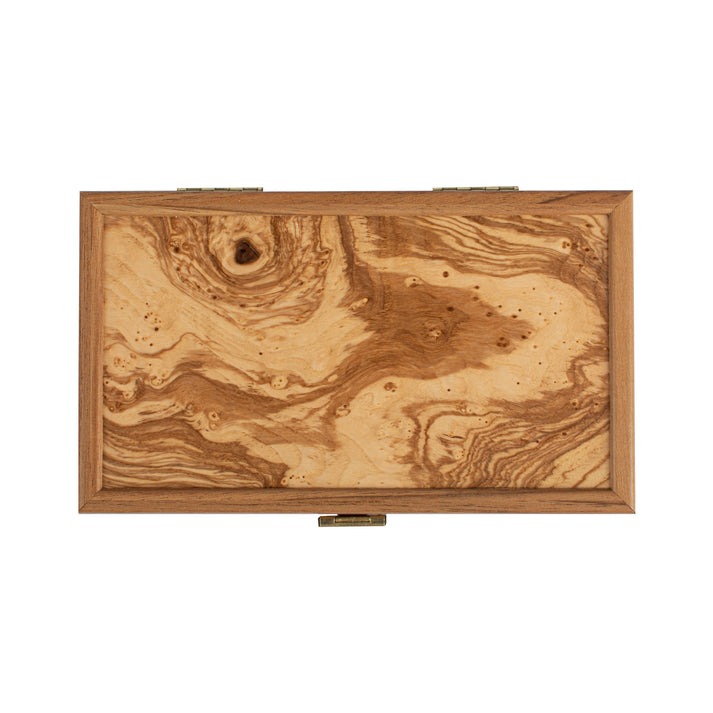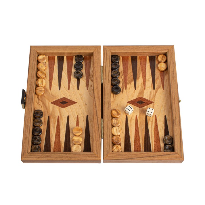 Kleines Reise-Backgammon aus Olivenholz mit Holzspielsteinen