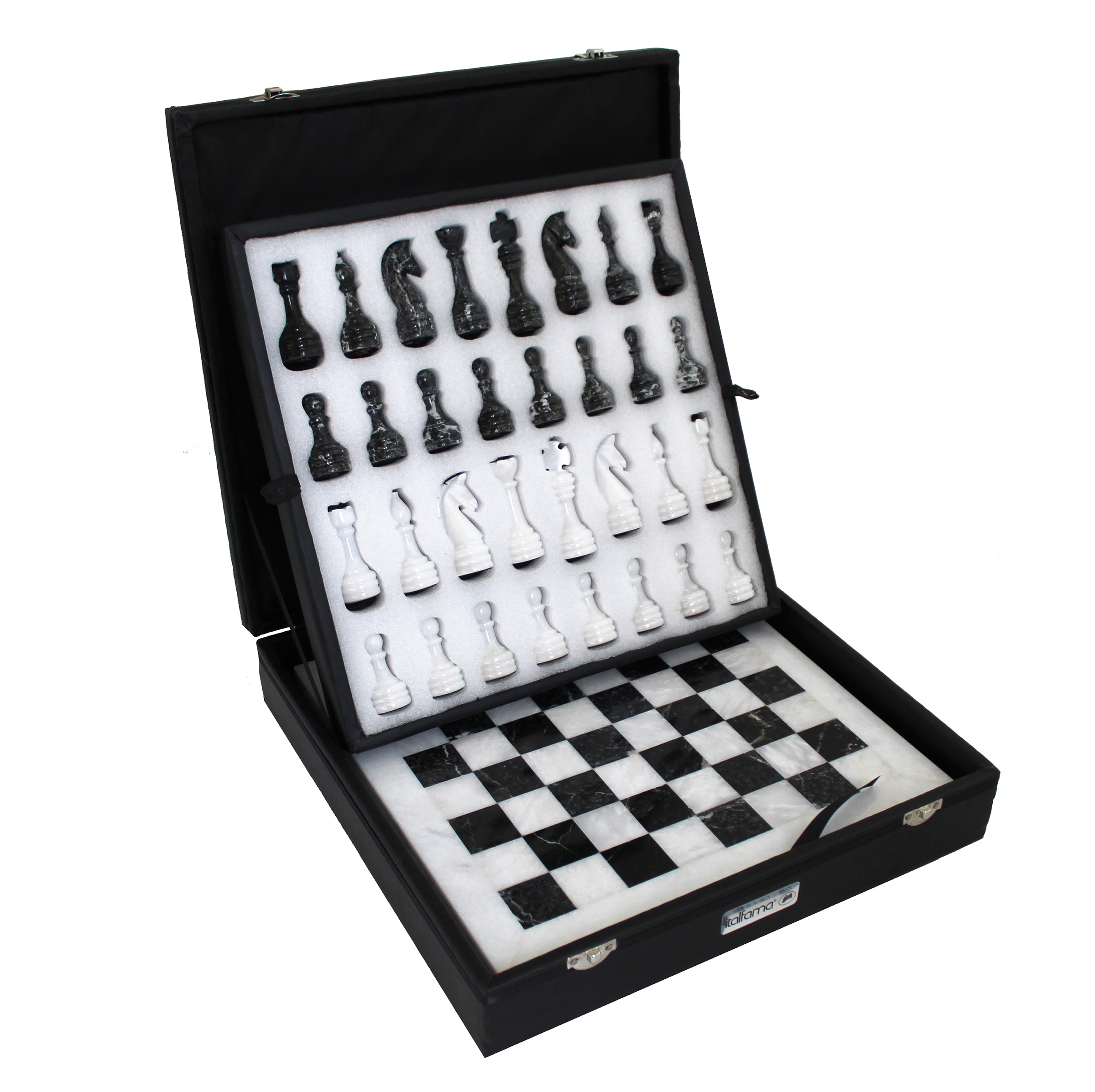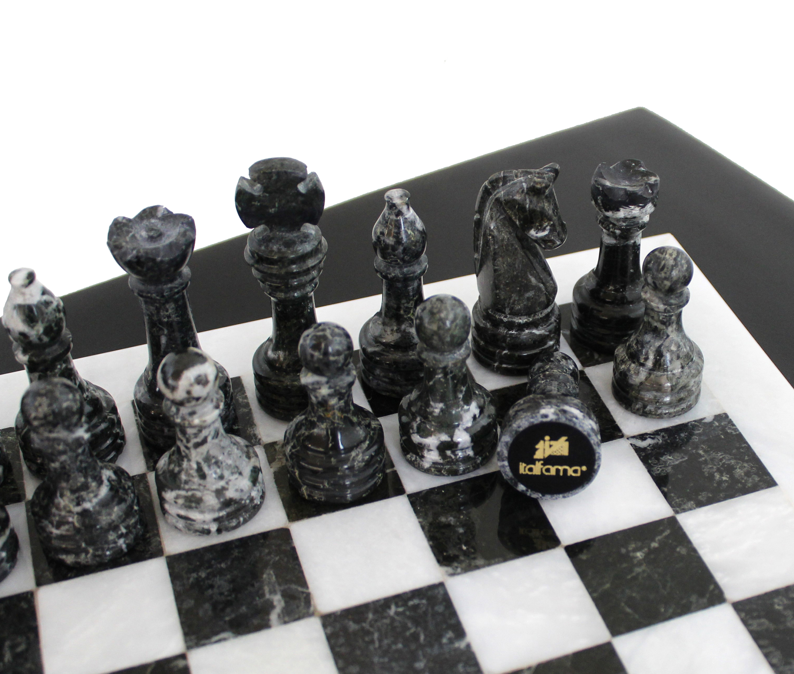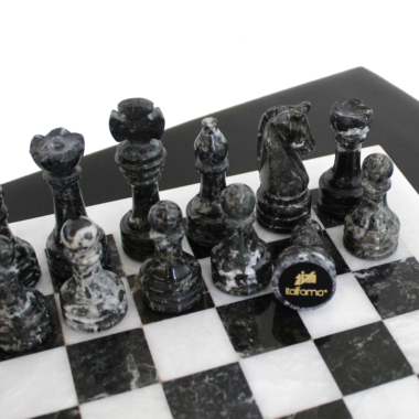 Dieses Schachspiel-Set aus weißem und schwarzem Marmor vereint Luxus und Tradition und bietet ein raffiniertes Spielerlebnis sowie ein außergewöhnliches Dekorationsobjekt. Hergestellt aus echtem Marmor, hebt das Schachbrett von 30 x 30 cm die natürliche Eleganz des Steins hervor, mit einem auffälligen Kontrast zwischen den weißen und schwarzen Feldern. Jede Figur zeigt die sorgfältige Handwerkskunst, die geleistet wurde und diesem Set einen einzigartigen Charakter verleiht.
