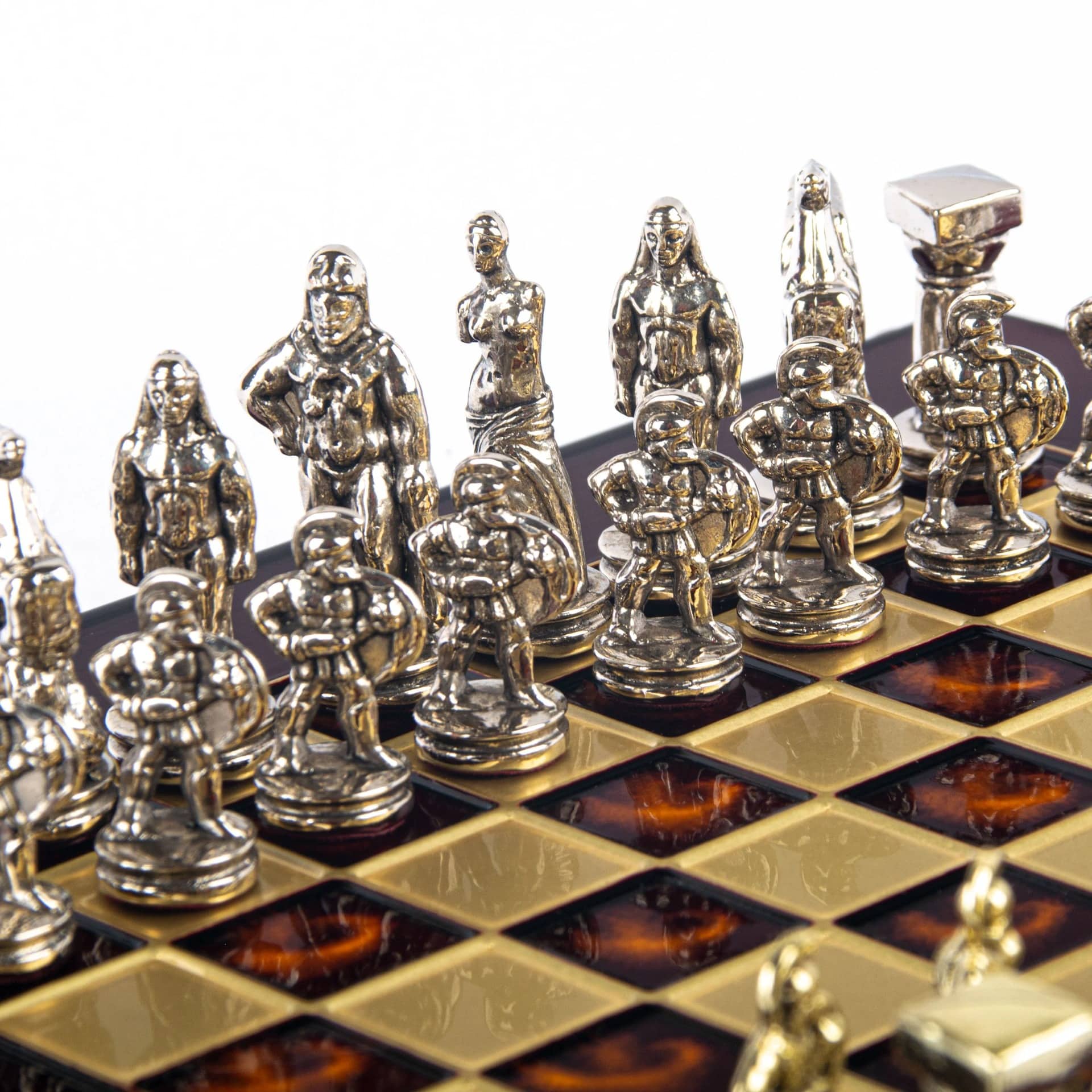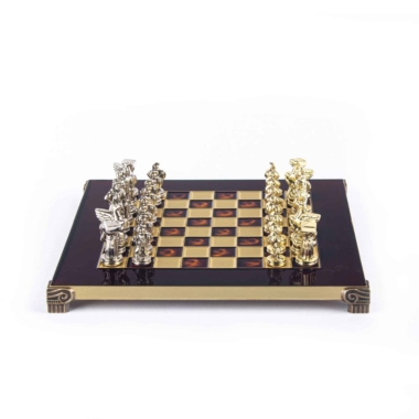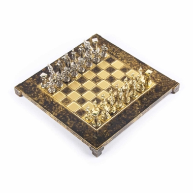 Kleines Schachspiel Spartanischer Krieger – Goldene & Silberne Figuren mit Metallspielbrett auf Fuß