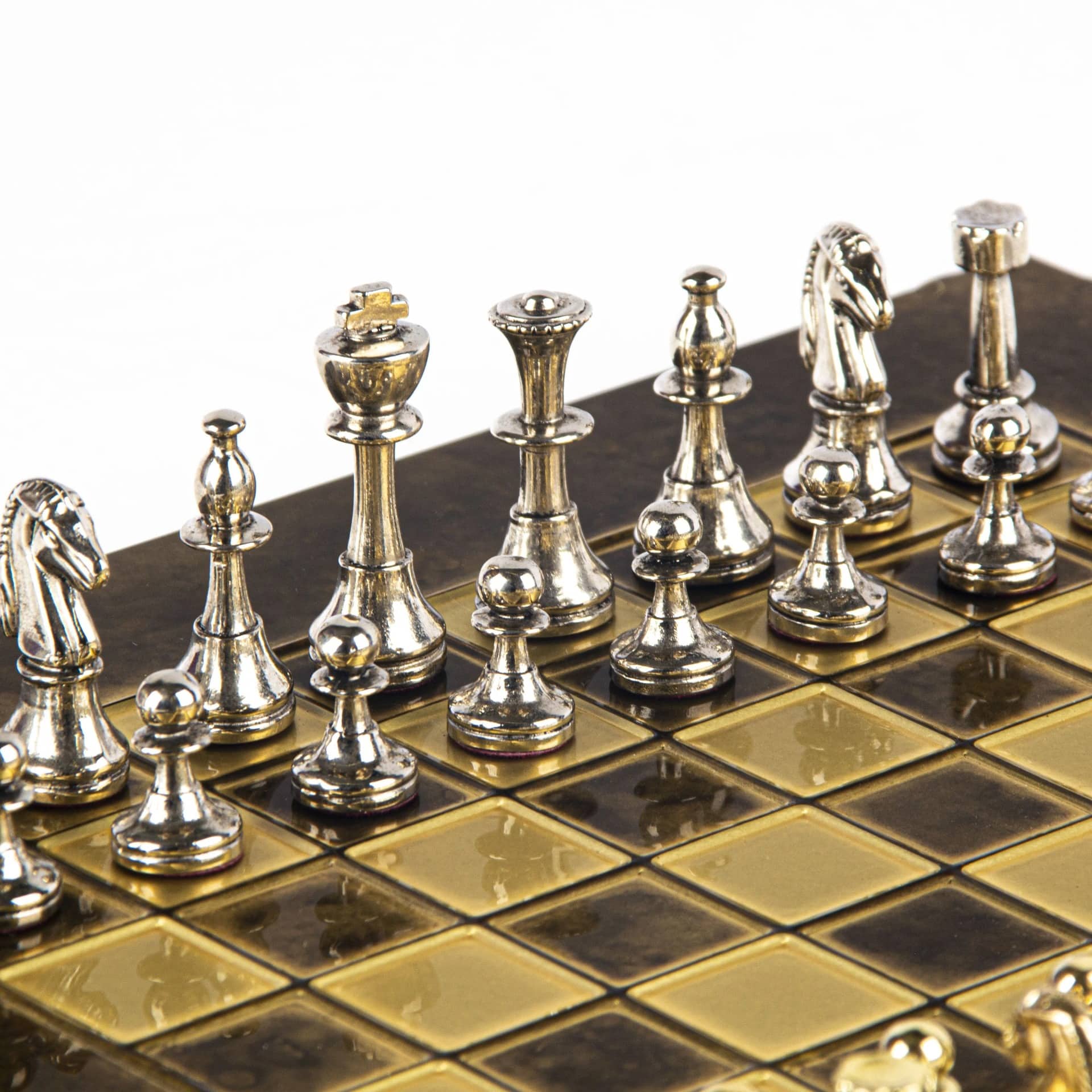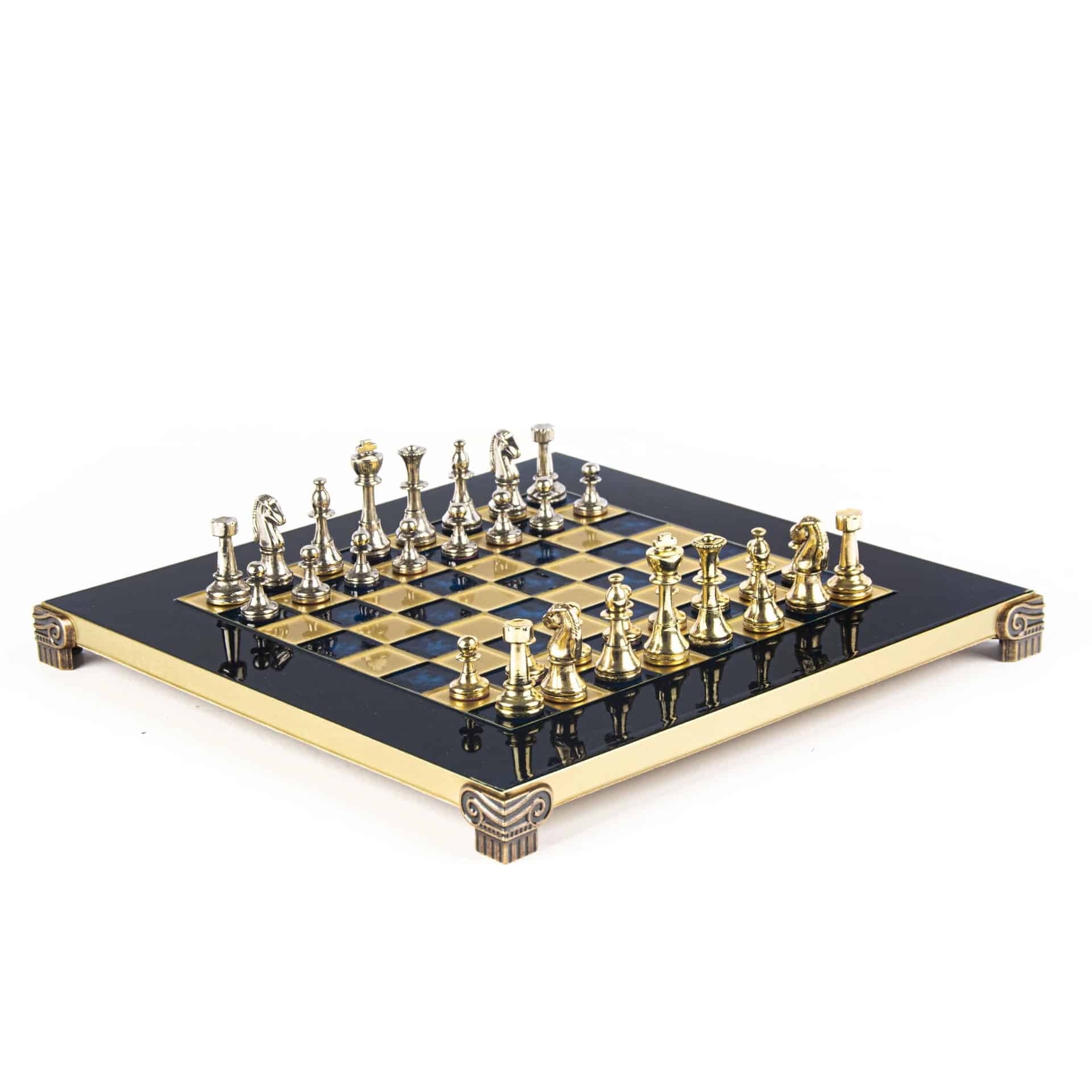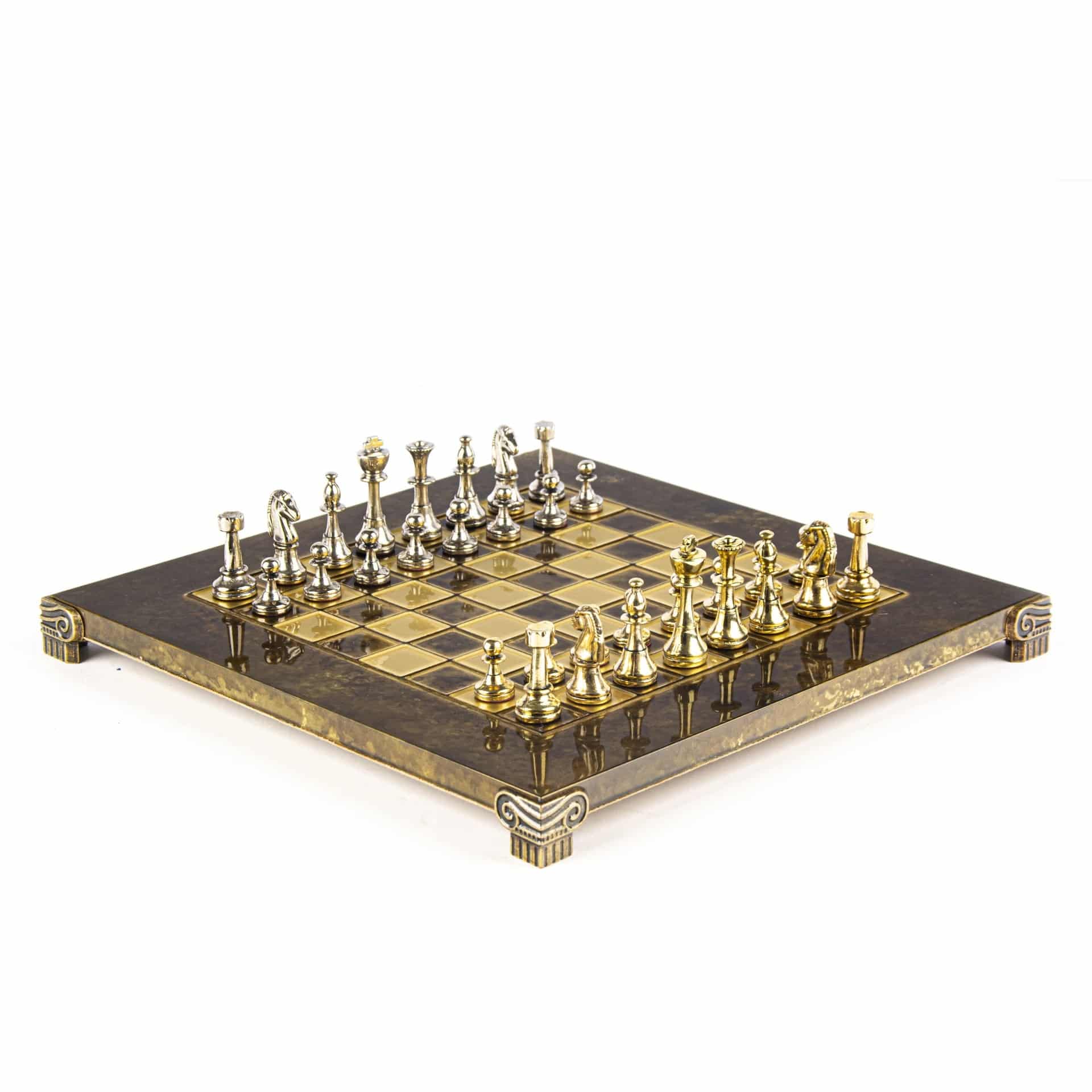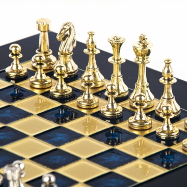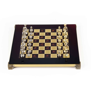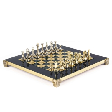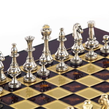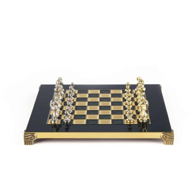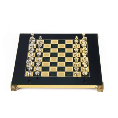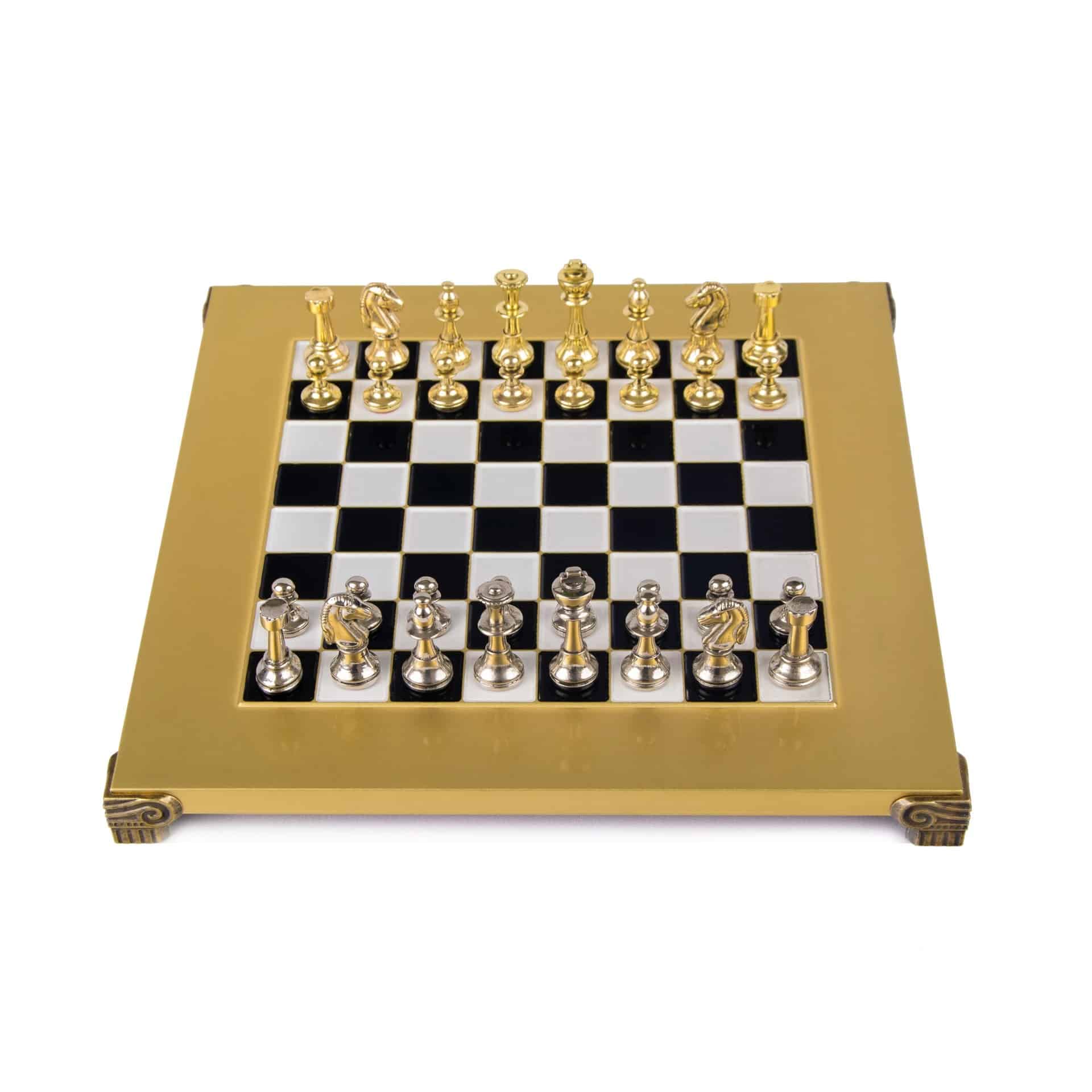 Das Schachbrett auf Fuß, mit kompakten Abmessungen von 28 x 28 cm, ist aus robustem Metall gefertigt und garantiert eine unübertroffene Haltbarkeit, während es ein modernes und elegantes Design bietet. Die Spielfläche zeichnet sich durch klare Linien und eine makellose Oberfläche aus, die harmonisch mit den Metallfiguren harmoniert, die sich darauf gegenüberstehen.