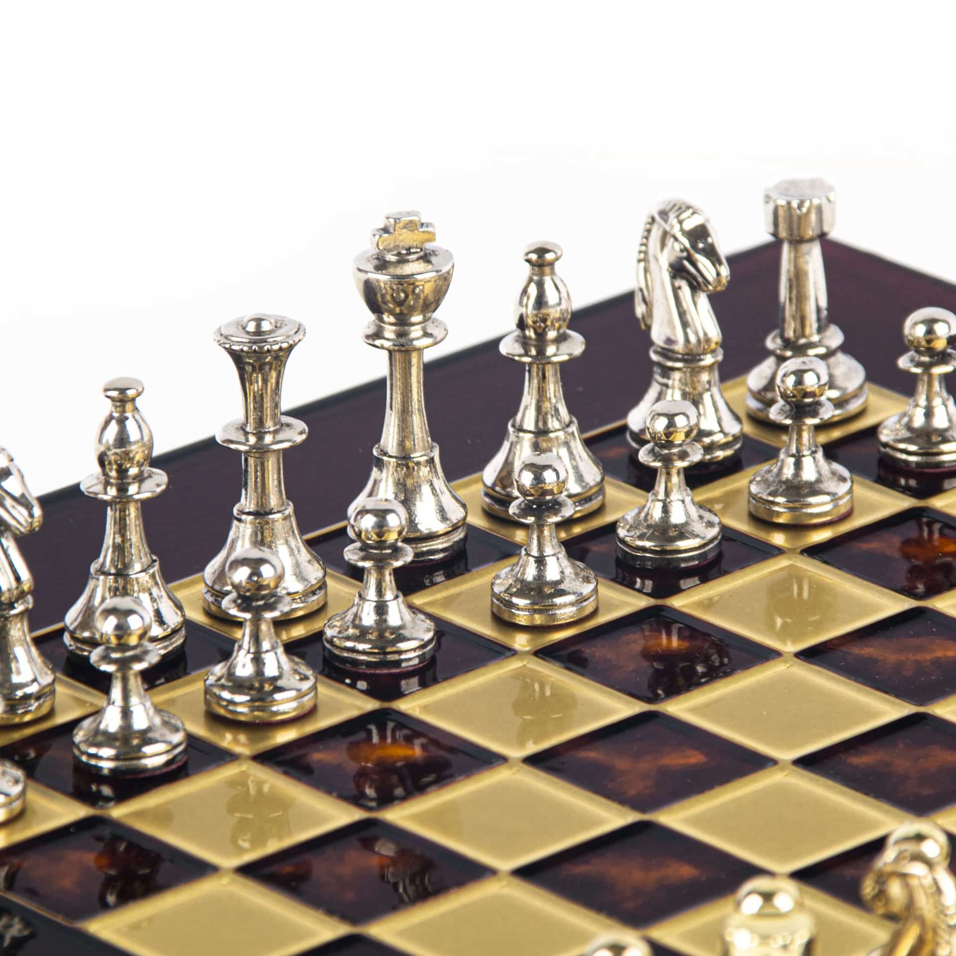 Ob Sie ein leidenschaftlicher Spieler sind oder das perfekte Geschenk für einen Schachliebhaber suchen, dieses Staunton-Set aus silber- und goldfarbenem Metall wird durch seine zeitlose Ästhetik und außergewöhnliche Qualität begeistern.