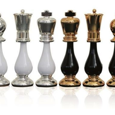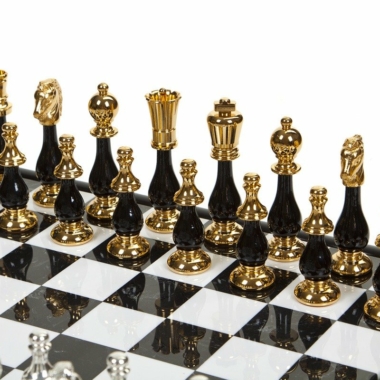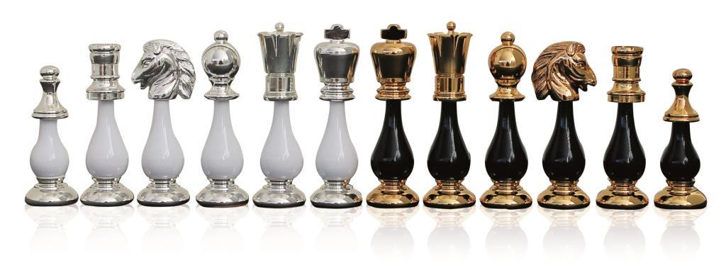 Die schwarzen und weißen Schachfiguren sind vollständig handgeschnitzt, poliert und gewichtet. Sie profitieren von einer 24-karätigen Gold- und Silberbeschichtung.