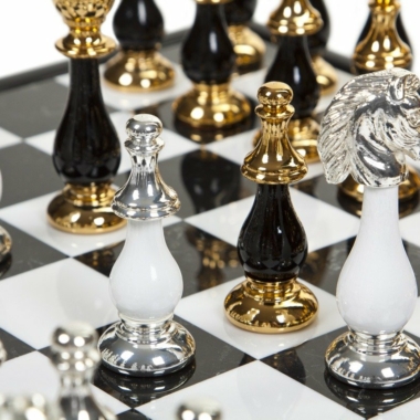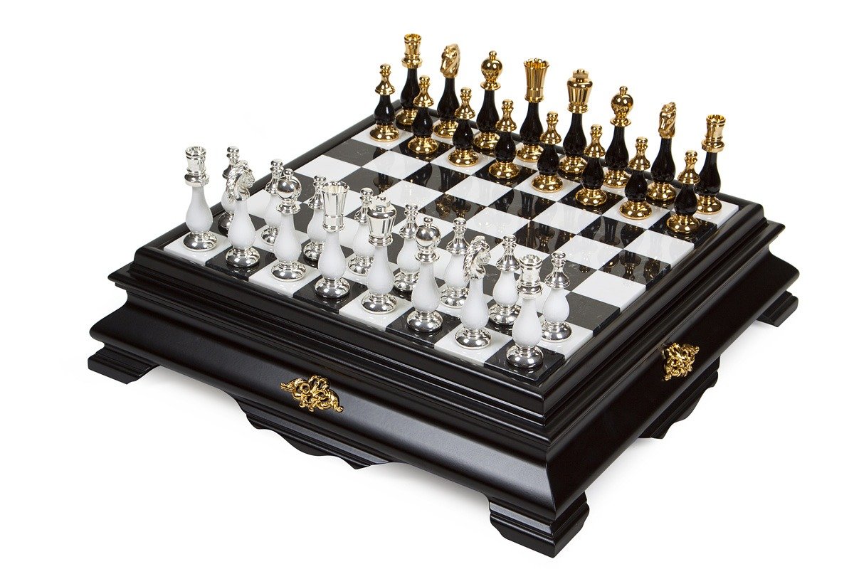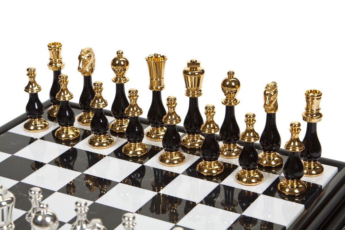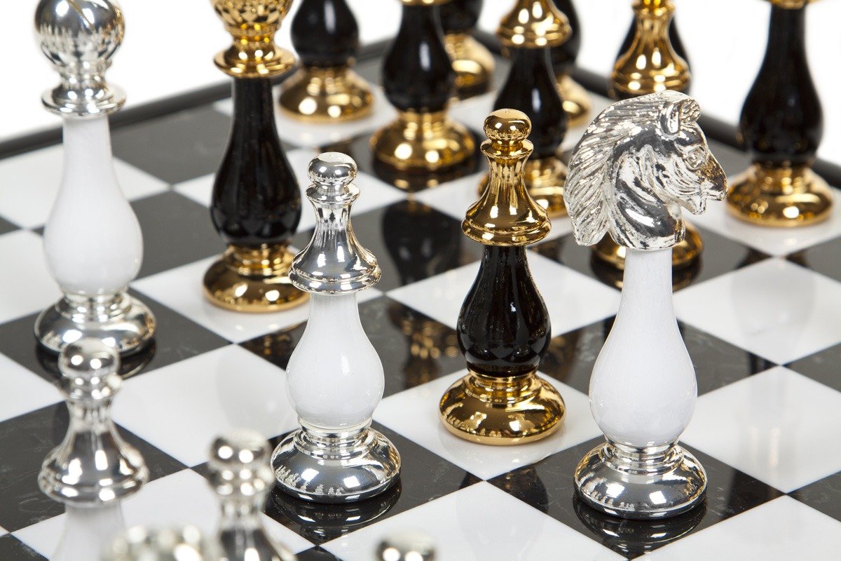 Ein wunderschönes luxuriöses Set eines modernen schwarz-weißen Schachspiels, das von unserem italienischen Handwerker hergestellt wurde, der seit zwei Generationen auf die Herstellung von Luxusschachspielen spezialisiert ist, für den die Liebe zum Detail, die Oberflächen und die Qualität der Materialien die Hauptmerkmale eines gelungenen Schachsets sind.