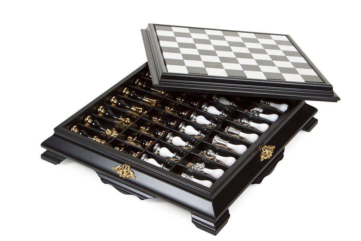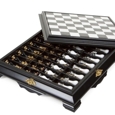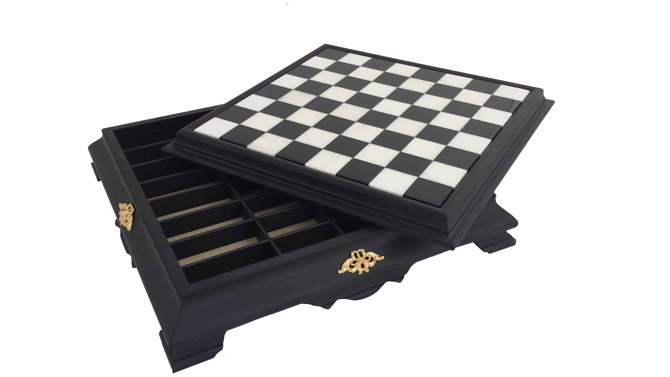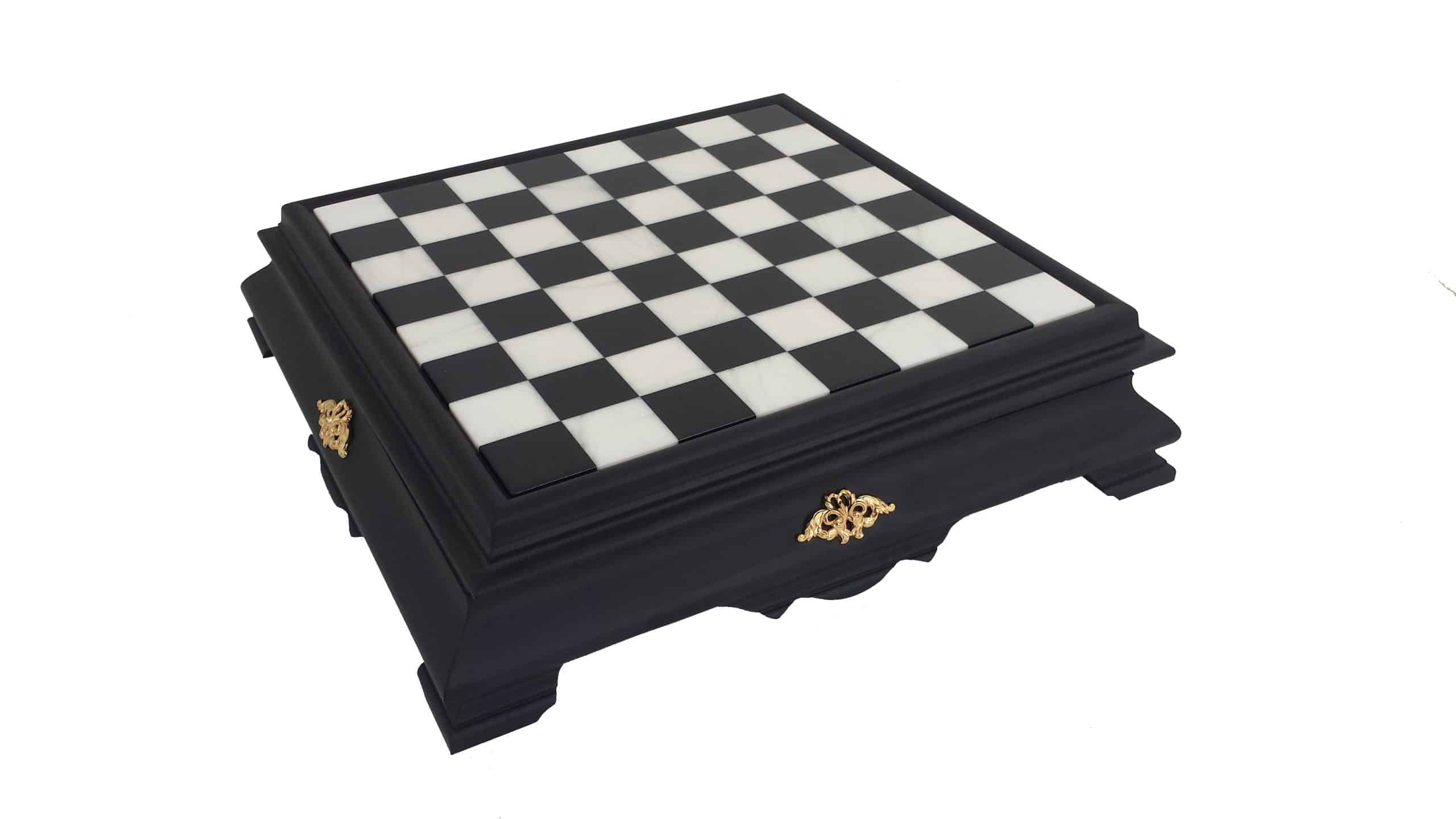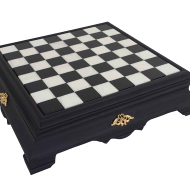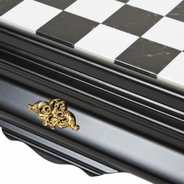 Das Schachbrett ist groß, es ist vollständig aus Holz gefertigt, sein Spielbrett aus schwarz-weißem Carrara-Marmor ergänzt das Gesamtbild perfekt.