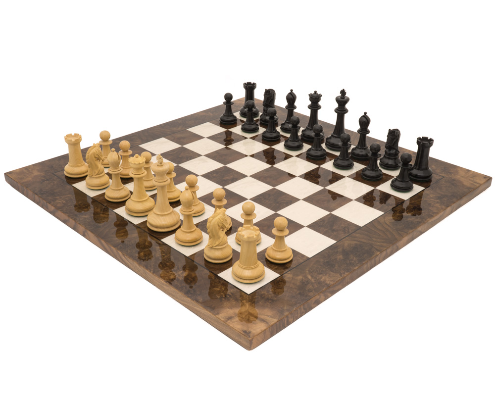 Luxuriöses Schachset aus Ebenholz und Nussbaum-Wurzel-Schachbrett – 60×60 cm